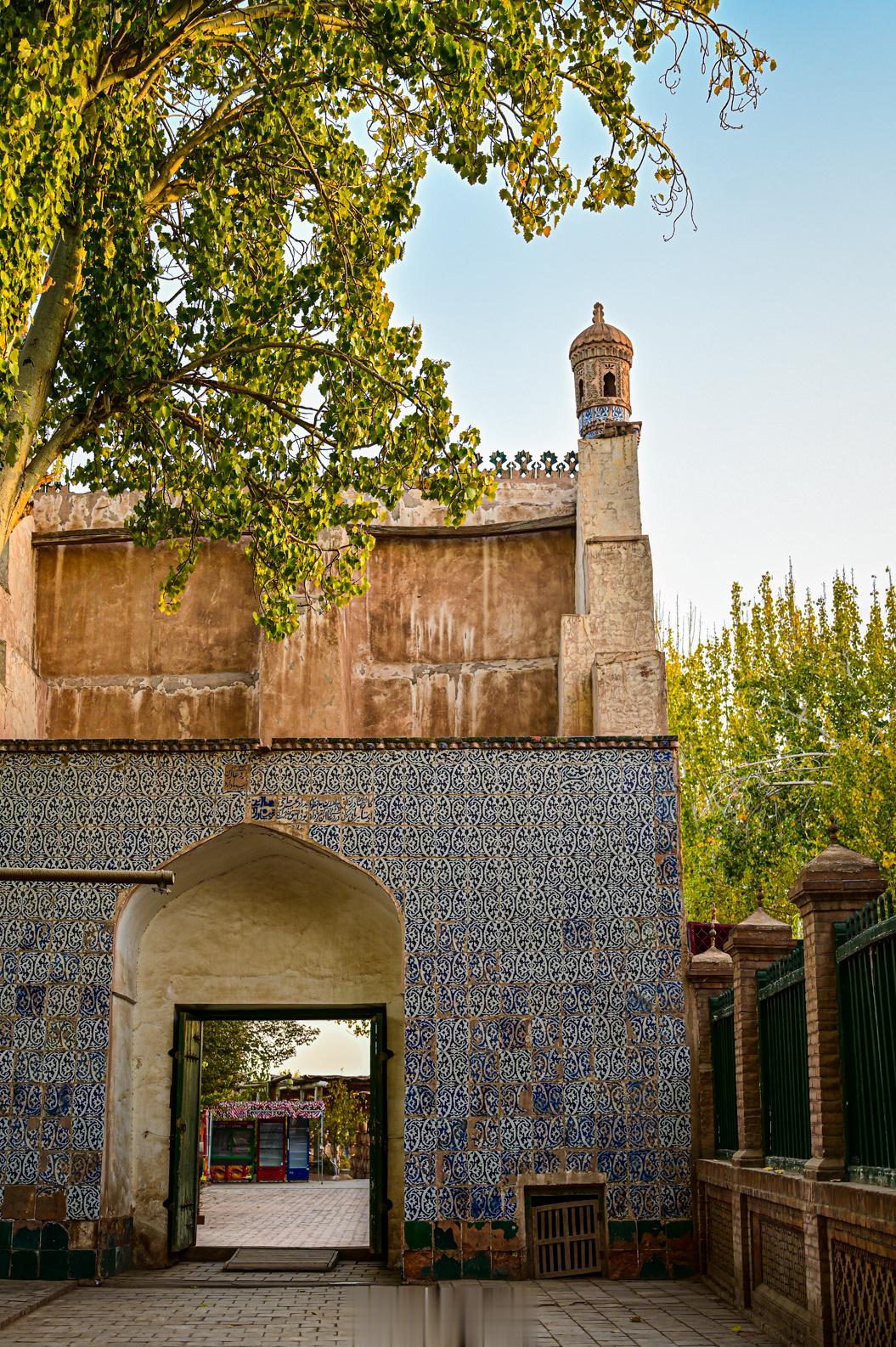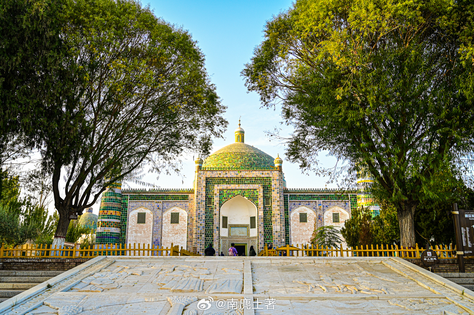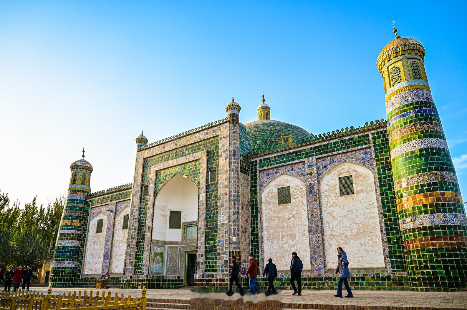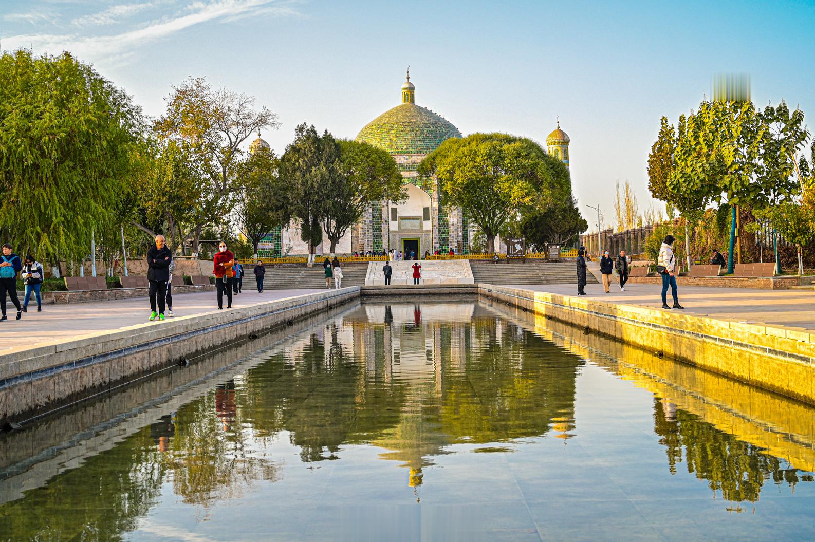 因为身上有一股沙枣花香,被乾隆选中,集千万宠爱于一身的“香妃”,死后葬在喀什,我也是才知道,还是叶尔羌王朝的后裔。香妃墓的伊斯兰教建筑保存完好,非常精美,广场的水池与陵墓主体对称,有点像印度的泰姬陵。