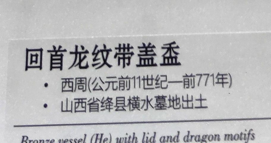 山西博物院 藏品“回首龙纹带盖盉”是一件来自西周时期的青铜器,高20.5厘米,口径14厘米。 盉的造型为扁圆形,平盖,圆口,束颈,扁腹,圈足。盖顶装饰着回首的龙纹,颈与腹部装饰着龙纹和鱼纹。盉的盖子、口、足部都有镂空的纹饰,整个器物工艺精湛,显示了西周青铜器制作的高超水平。