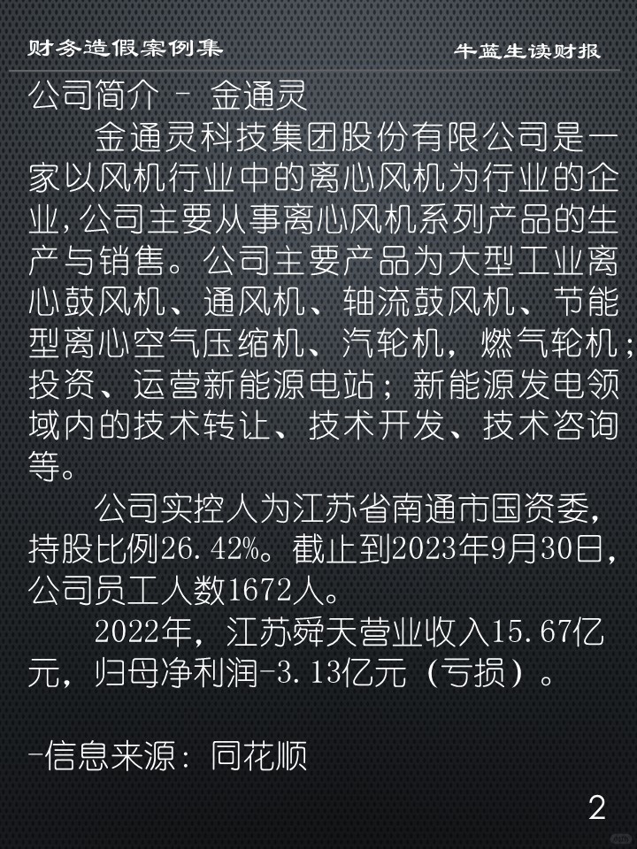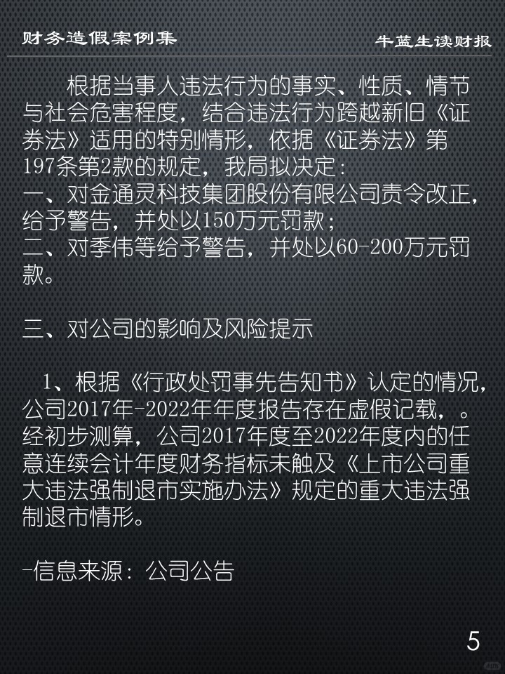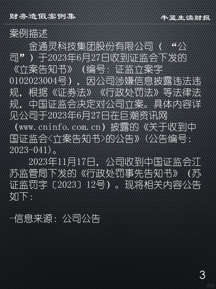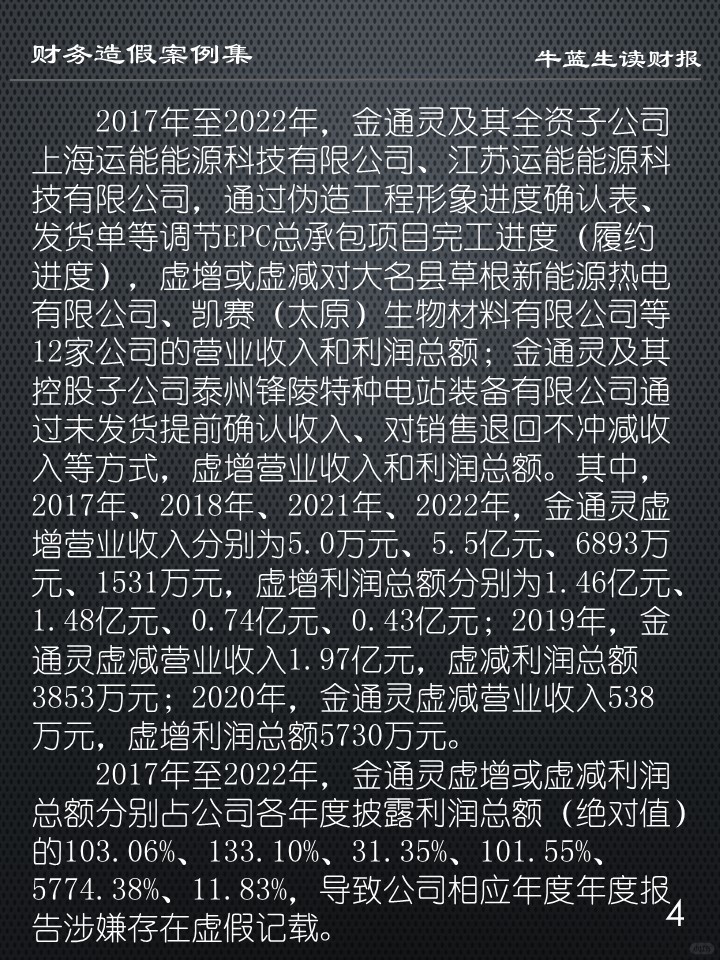 ✈公司:金通灵 造假金额:2017/2018/2021/2022年合计虚增利润4.1亿元,2019/2020年合计虚减利润1.0亿元 主要手段:通过伪造工程形象进度确认表、发货单等调节EPC总承包项目完工进度(履约进度),虚增或虚减营业收入和利润总额,等 证监会行政处罚事先告知书:[2023]12号,江苏证监局,2023-11-17 公司公告:2023-065 后果:公司及相关人员被处罚。