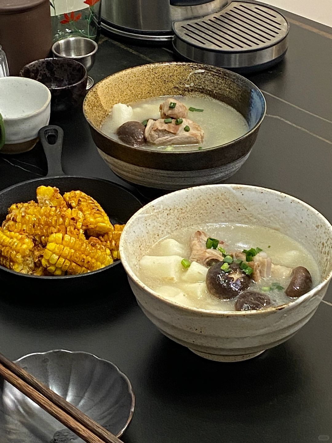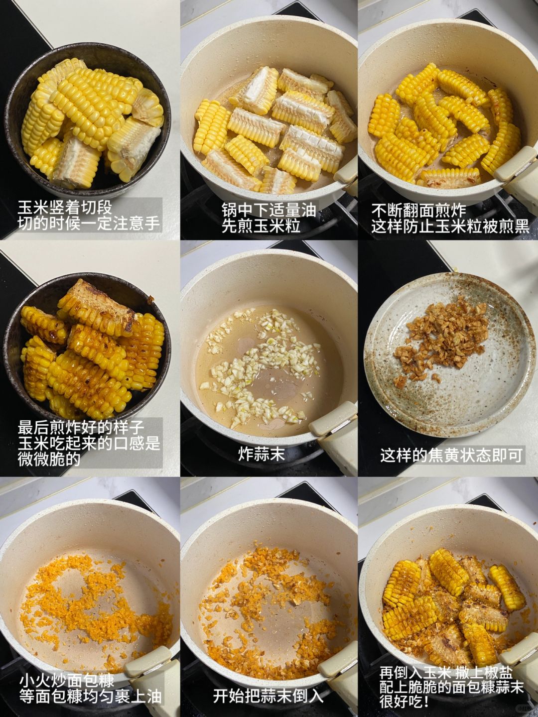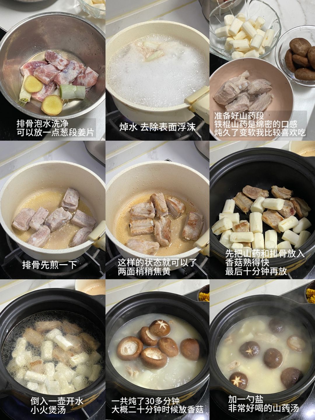今日食谱: 山药排骨汤|椒盐玉米 ——————【山药排骨汤】—————— 食材: 肋排|铁棍山药|香菇 准备工作: 1)清洗肋排,来回用流水泡三四遍,直到没有血水,泡的时候可以加一点葱段和姜片,排骨清理的干净喝起来的汤才很鲜没有异味,总共泡了40分钟 2)泡完排骨开始焯水,焯水加一些葱段、姜片、料酒,等水开后去除浮沫即可捞出备用 3)煎制排骨:这一步也很关键,能让整个汤带点油水也更好喝,锅中下油,排骨两面煎制一会儿即可 制作: 1)将煎好的排骨和山药一起放入煲锅中,倒入开水小火炖煮,我煲了大概30分钟,等待大概20分钟时就可以把香菇加进去,然后加一勺盐(盐勺大小)就可以了 tips:煲汤的调料无需加太多,加盐即可,小火慢煲出来的汤也是奶白色的,非常好喝 ——————【椒盐玉米】—————— 食材: 玉米段|面包糠|蒜末|椒盐 步骤: 1)玉米段洗净擦干切小段,锅中下油,油稍多一点,开始煎炸一下玉米,玉米表面呈微焦状,玉米芯变弯大概就可以了 2)炸蒜末:锅中下油,把蒜末放入,这一步只要把蒜末炸干一点就可以了,捞出备用 3)炒面包糠:这一步小火进行,锅中下一点油,把面包糠放入炒酥脆后加入蒜末,一起翻炒,然后把炸好的玉米段放入,再撒椒盐粉