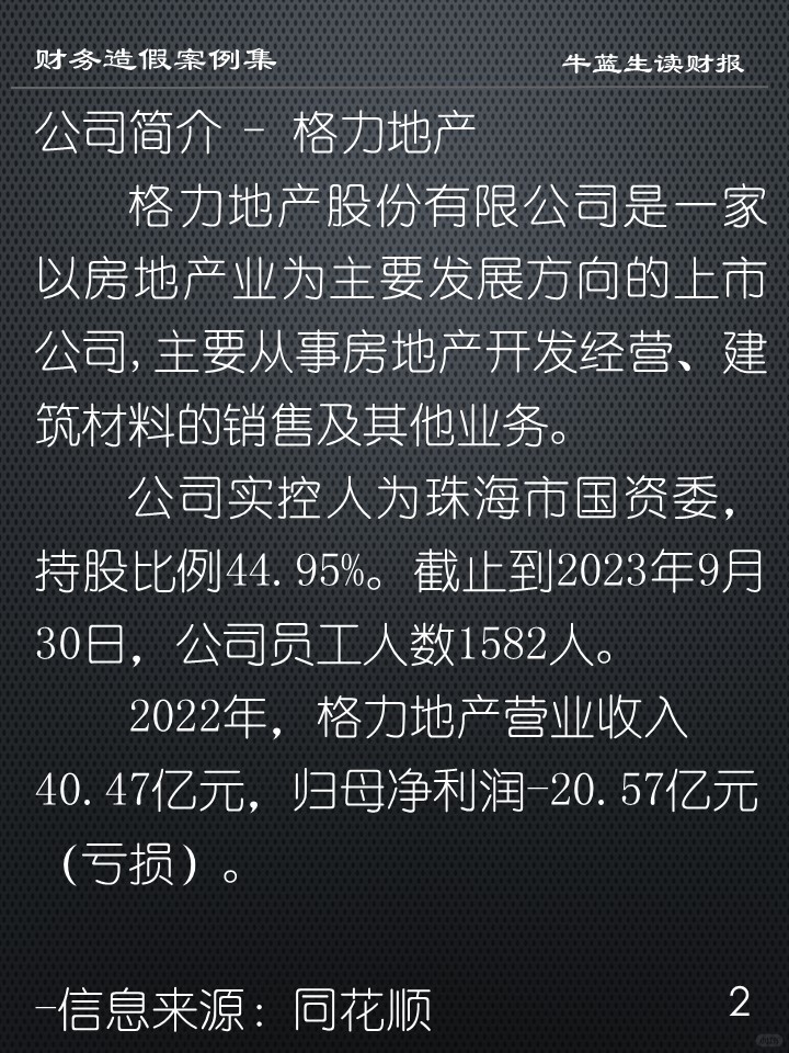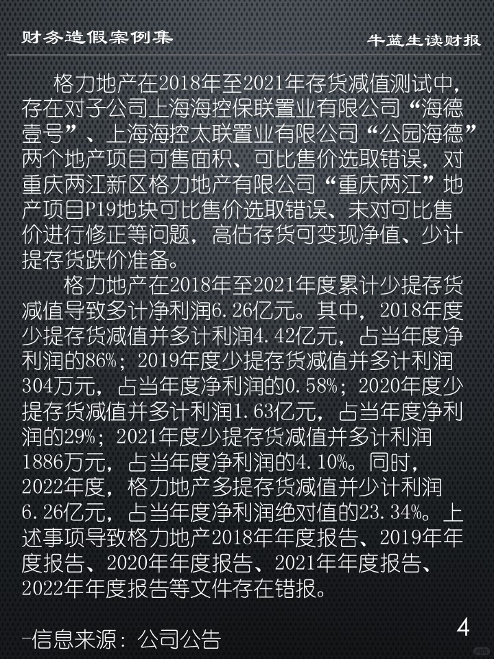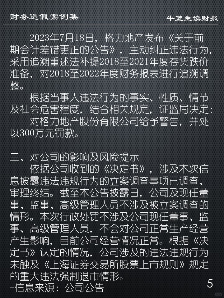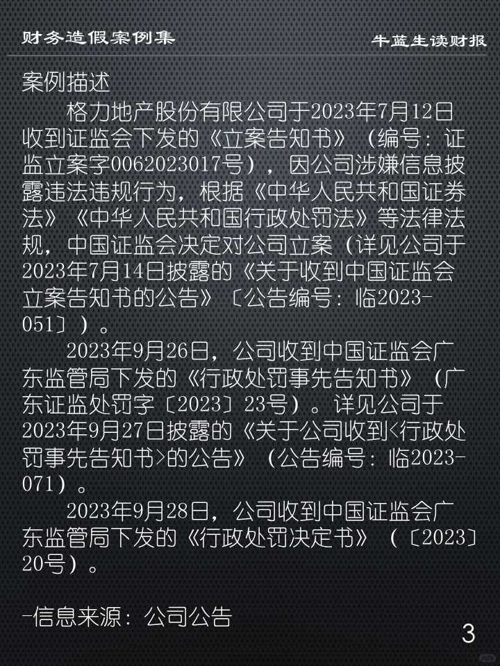 ✈公司:格力地产 造假金额:2018-2021年虚增利润6.26亿元 主要手段:少提存货减值 证监会行政处罚事先告知书:[2023]23号,广东证监局,2023-9-26 处罚决定书[2023]20号,2023-9-28 公司公告:临 2023-076 后果:公司及相关人员被处罚。