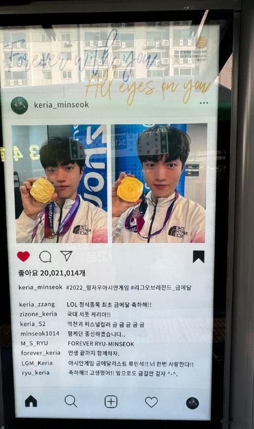 此次T1夺冠之后,街上可以看到关于T1的应援牌,然后Keria看到之后专门去拍照进行打卡留恋!