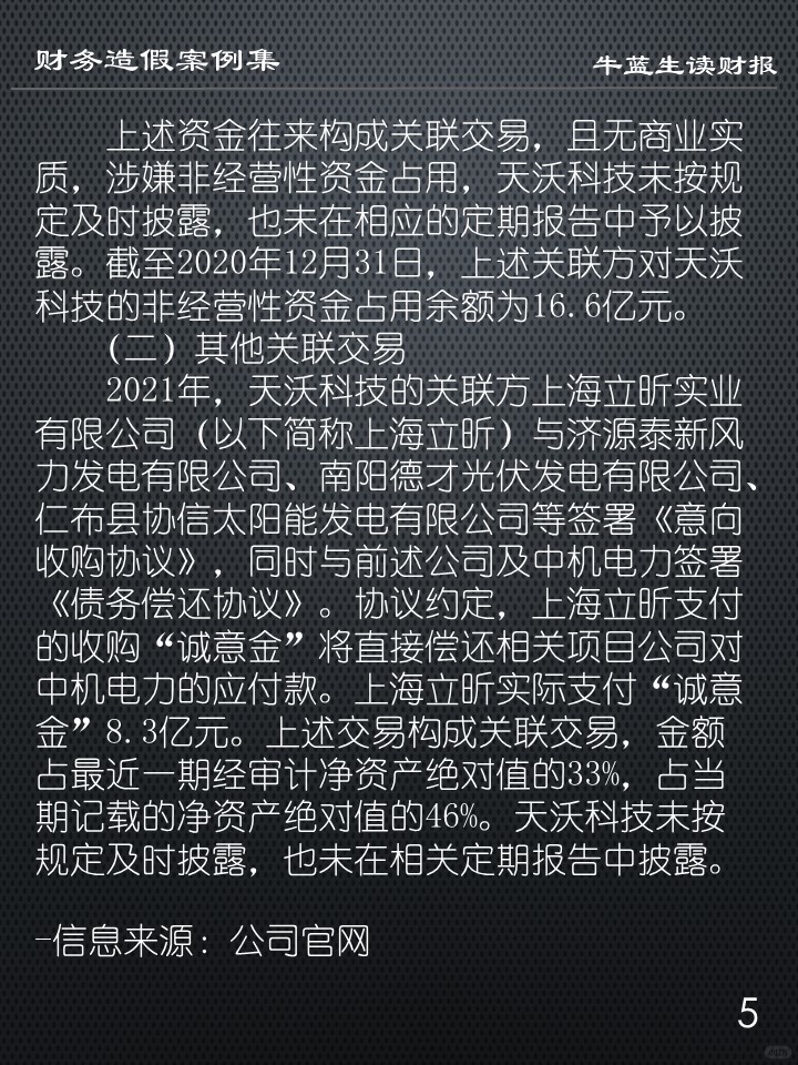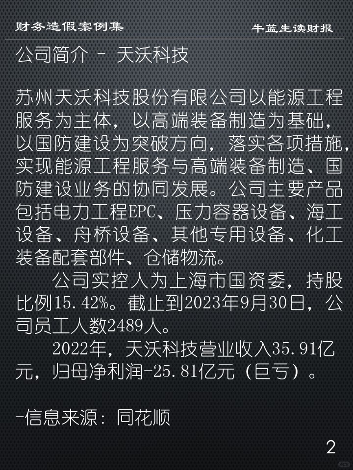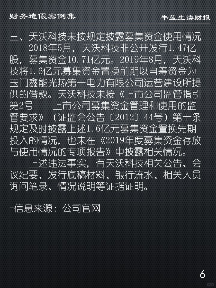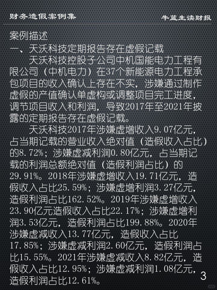 ✈公司:天沃科技 造假金额:2017-2019年合计虚增营业收入53亿元,虚增利润7.6亿元;2020-2021年合计虚减营业收入23亿元,虚减利润3.7亿元 主要手段:通过制作虚假的产值确认单虚构或调整项目完工进度,调节项目收入和利润 证监会行政处罚事先告知书:[2023]56号,证监会,2023-10-25 公司公告:2023-093 后果:公司及相关人员被处罚。