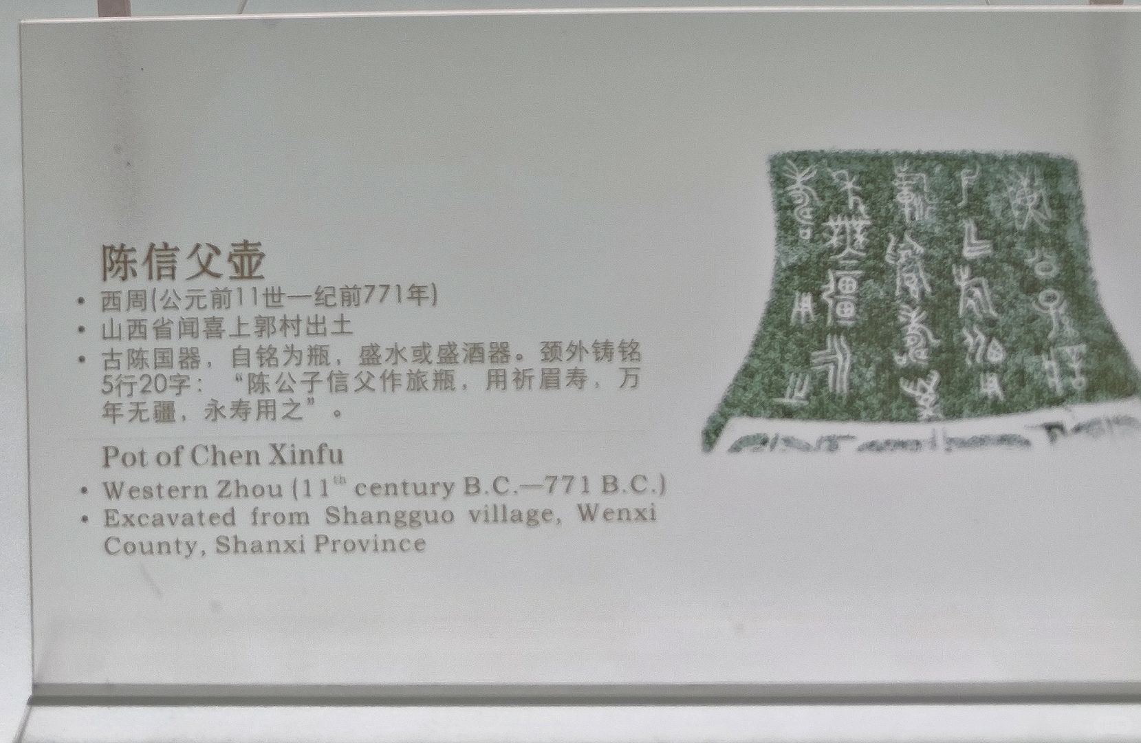 陈信父壶是一件春秋时期的青铜壶,1978年出土于山西省闻喜县上郭墓地中。现藏山西博物院 。 器体扁平,长方形口,直口微侈,短颈斜肩,环形双耳,肩以下斜收成平底,腹下部一侧有一圆形鋬。肩部饰有四足回首相对的夔龙纹。自铭为瓶,颈外壁铸铭文5行20个字:“陈公子信父作旅瓶,用祈眉寿,万年无疆,永寿用之”。 这件青铜壶为陈国器,陈国是西周时期的重要诸侯国,存世青铜器极少。