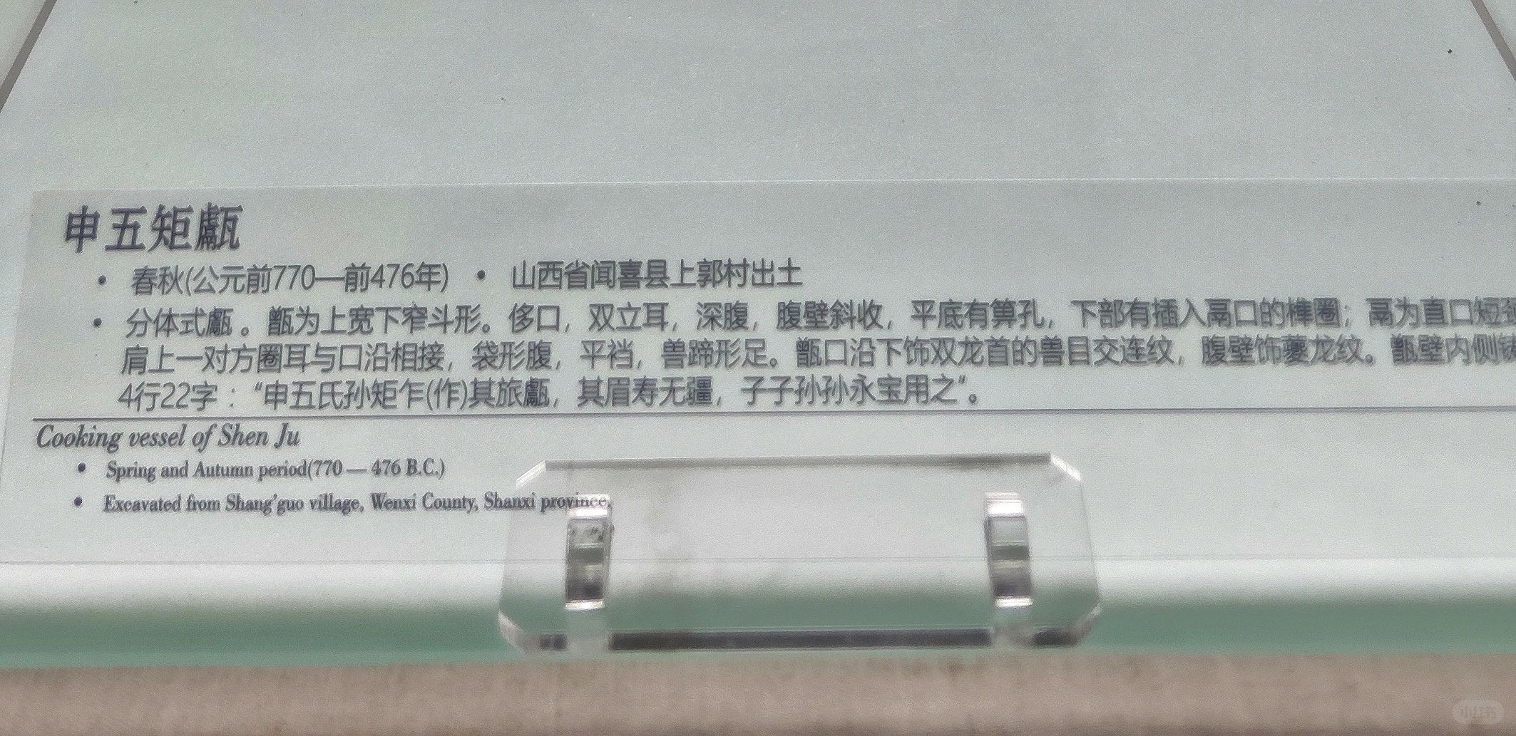 春秋(公元前770﹣前476年).山西省闻喜县上郭村出土。现藏山西博物院 分体式甗。甑为上宽下窄斗形。侈口,双立耳,深腹,腹壁斜收,平底有算孔,下部有插入高口的榫圈;肩上一对方圈耳与口沿相接,袋形腹,平裆,兽蹄形足。甑口沿下饰双龙首的兽目交连纹,腹壁饰夔龙纹。甗壁内侧铸有4行22字:"申五氏孙矩乍(作)其旅氲,其眉寿无疆,子子孙孙永宝用之"。