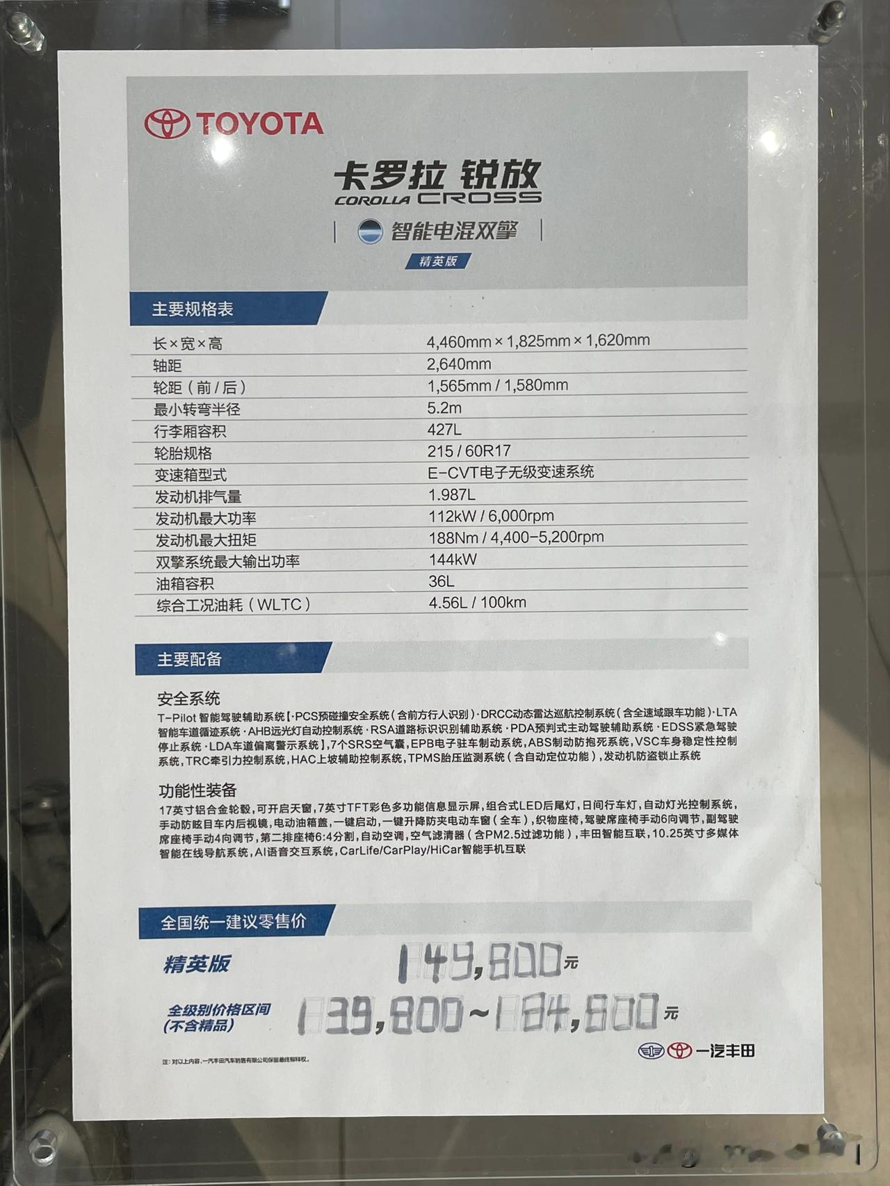 看了卡罗拉锐放实车终于明白网上为什么唱衰丰田了:展车明明不是最低配,但全卤素光源、全硬塑料内饰、手动座椅同屏出现,在2023年这个价位的车里还是头一回见(用料连自家的雷凌都不如),感知品质简直可以给负分。空间更是惨不忍睹,跟差不多尺寸的大众途岳都没法比。除了一套还算能打的2.0L混动总成和品牌老本之外,这车真的很难找到什么卖点,优惠5万+才值得考虑,但也仅仅是考虑。