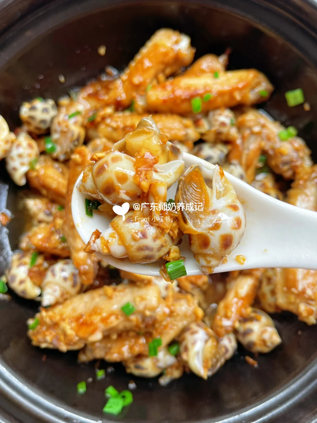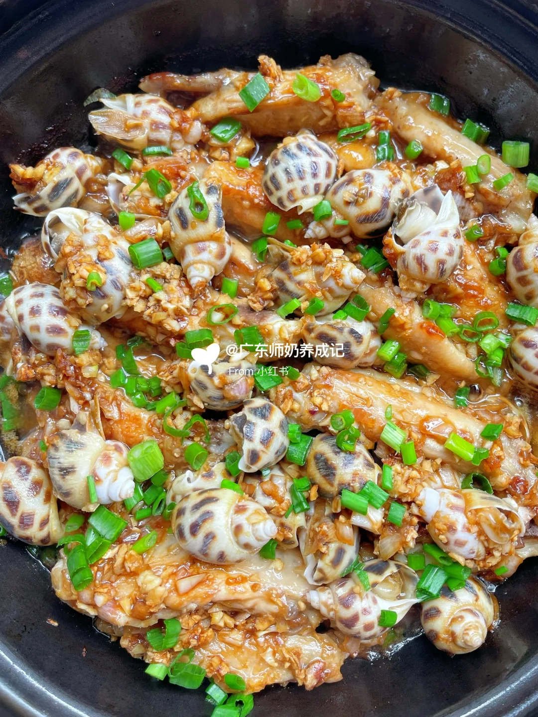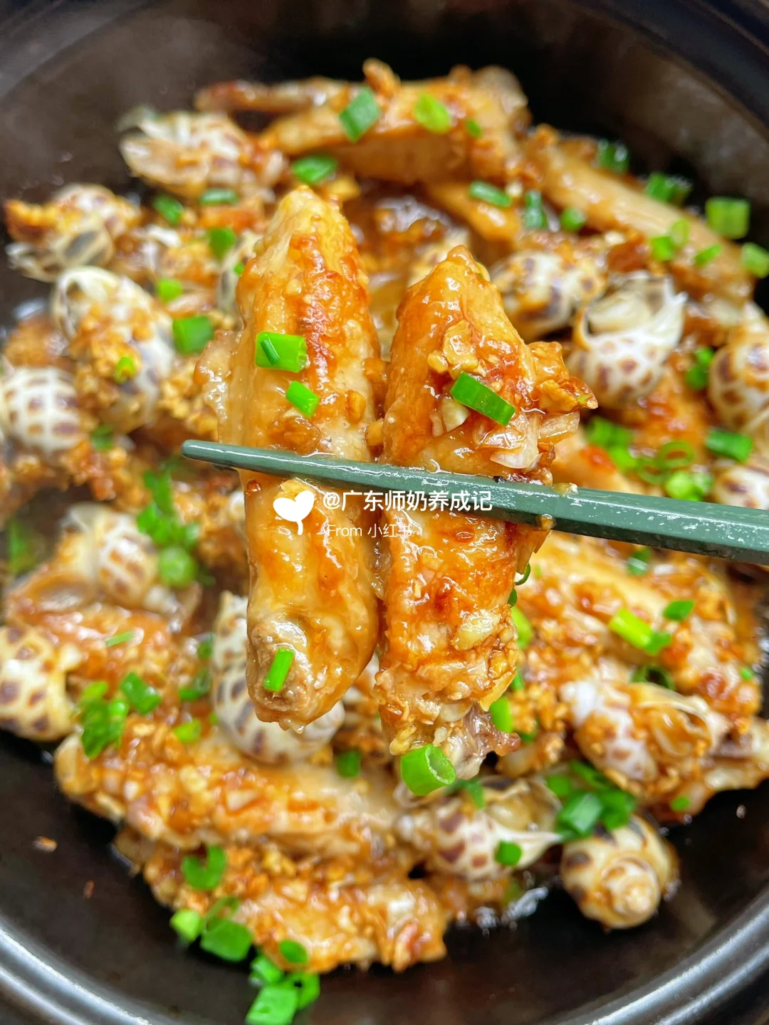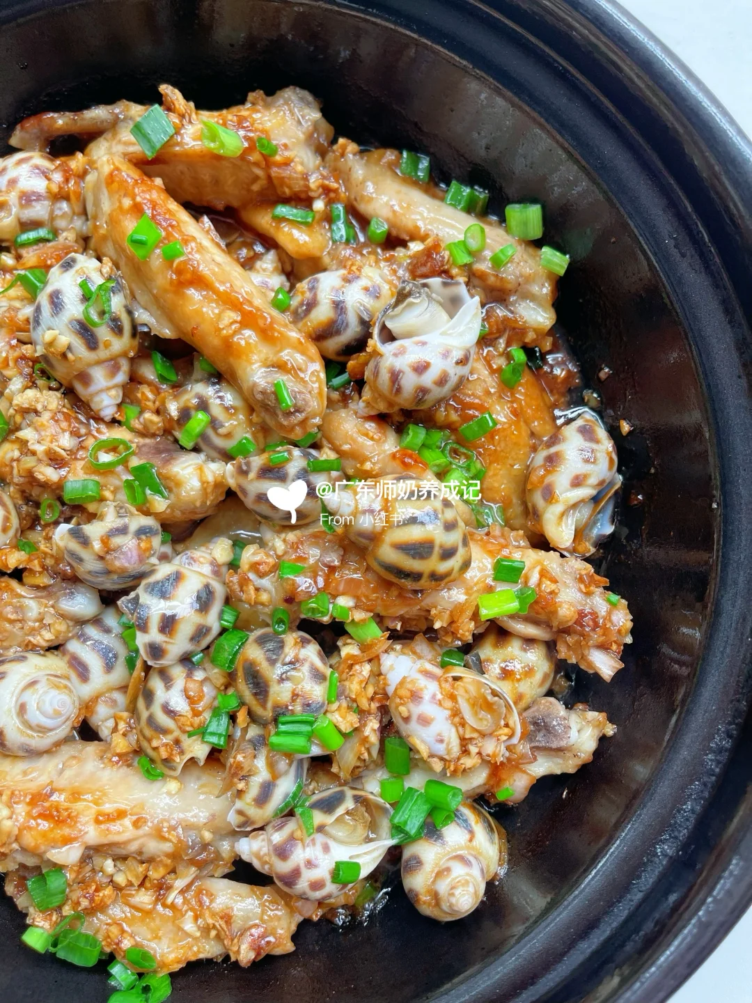 🔥一滴水都不用加,广式经典花螺鸡翅啫啫煲,花螺Q爽弹牙,吸收了鸡汁的香味,连壳都吮干净❗️鸡翅焦香多汁,搭配独特沙姜味,绝绝子❗️