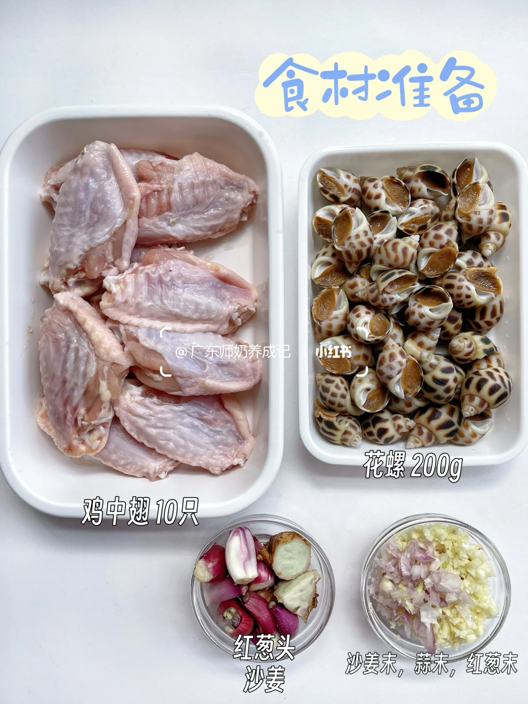 📝【食材】:鸡翅,花螺,沙姜,红葱头,大蒜,葱花