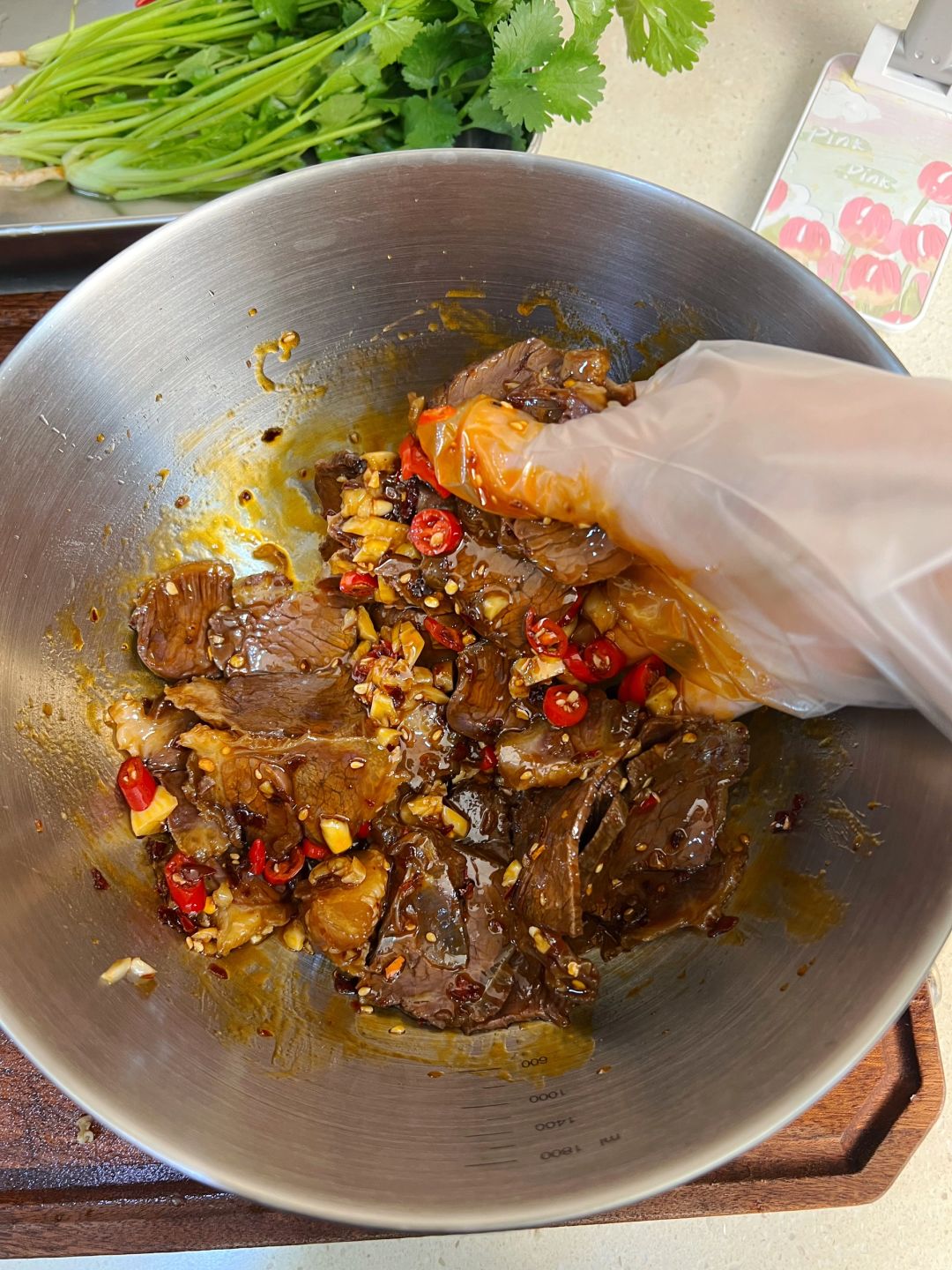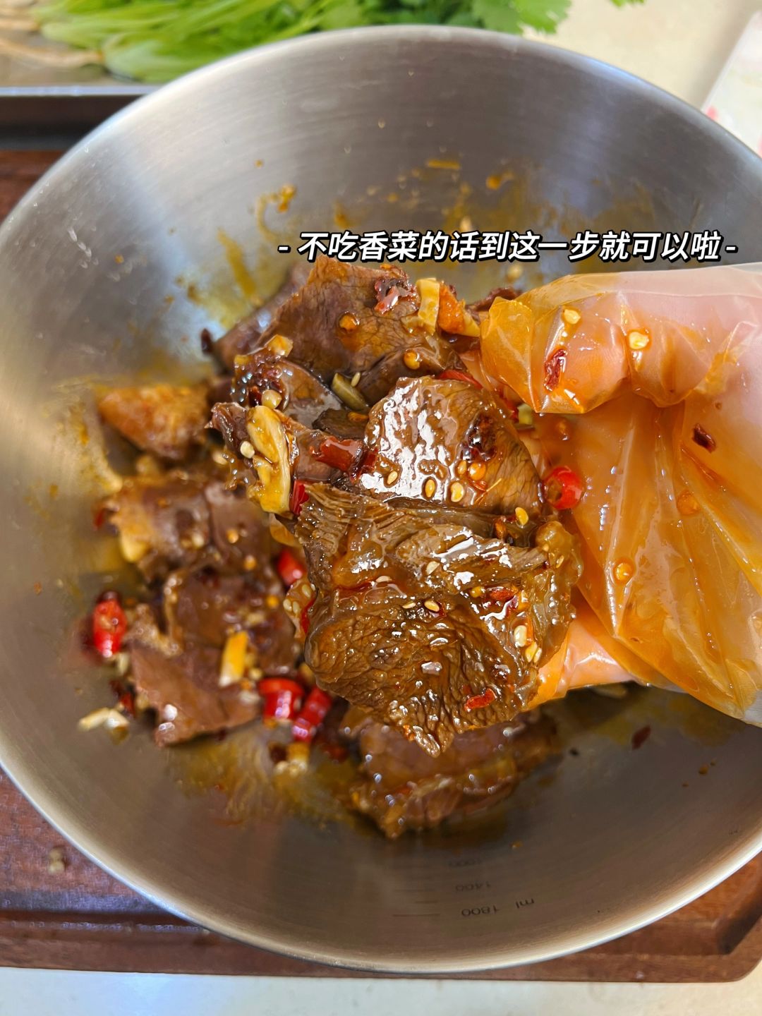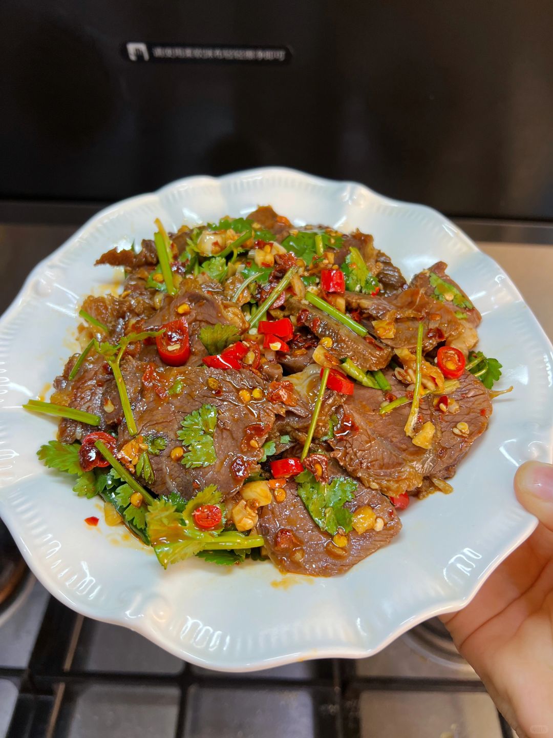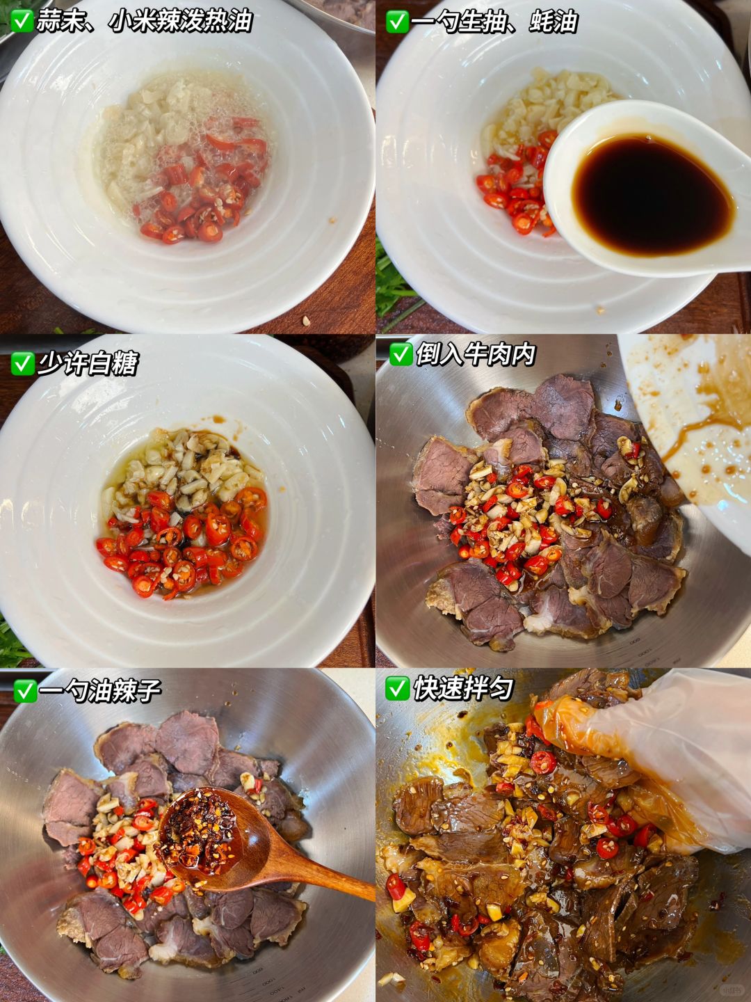 4、凉拌做法:碗内放蒜头、小米辣,烧热油,放适量生抽、蚝油、白糖、油辣子拌匀,再倒入卤牛肉片、香菜拌匀即可;