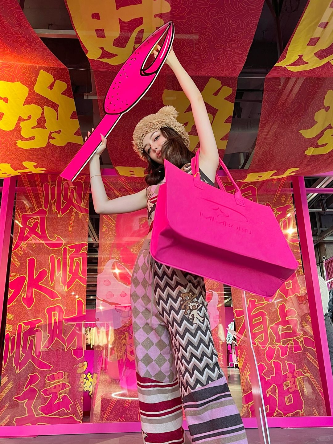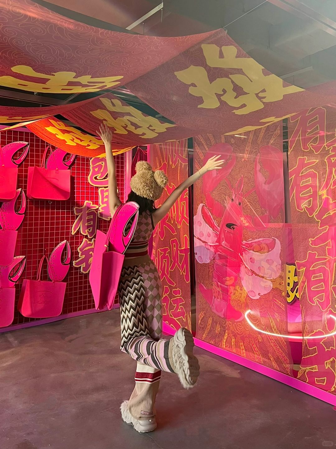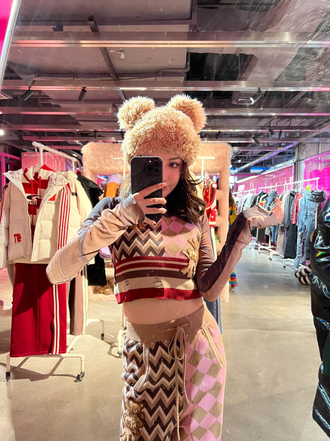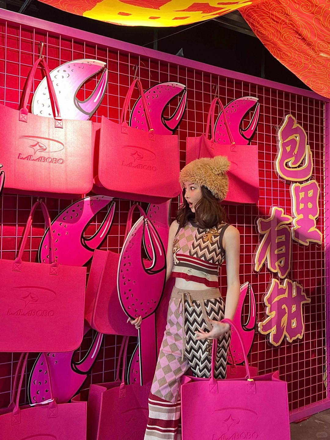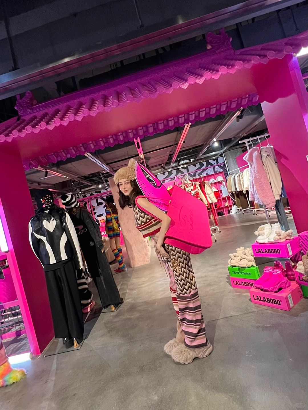 每周一次THE BOX! 2024新一年第一站 ——— 打卡LALABOBO!💖 好朋友拉着我逛,发现竟然出了黑色辣酷🕶风格。 上身的针织小套装🧥我一眼看中,偏复古辣妹风格,短款横条上衣和高腰裤设计超显腿长,搭配了同色系的小熊🐻帽子和毛毛鞋。 没有女生不喜欢粉色!粉色灯笼🏮的中式屋檐门头太好拍了,还有一列假人模特伙伴可以合影、现场还有互动小游戏和🧧利哦~