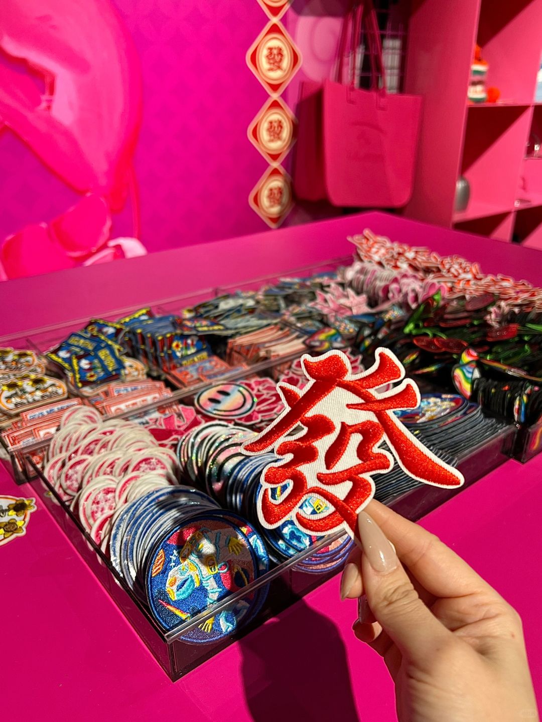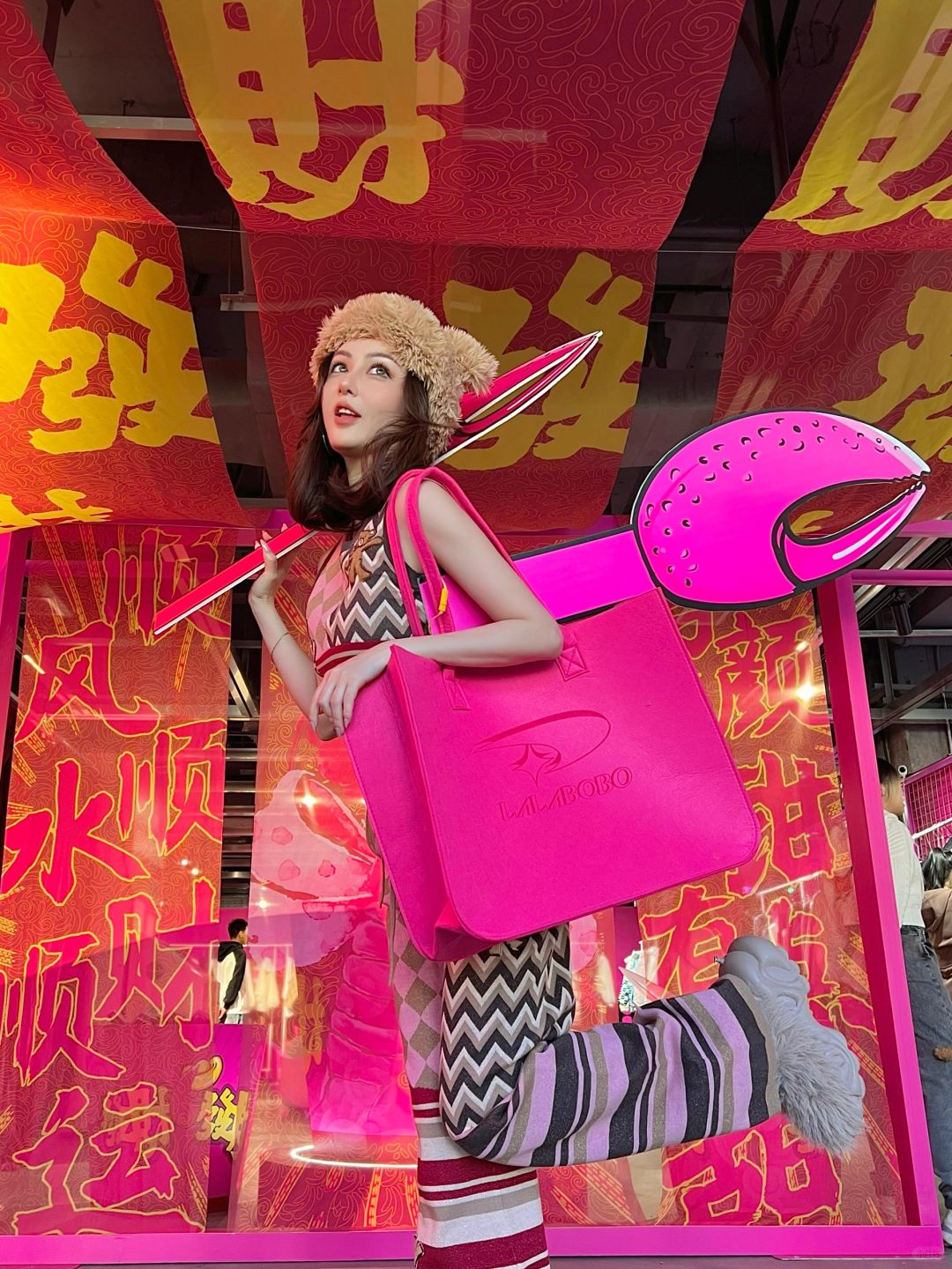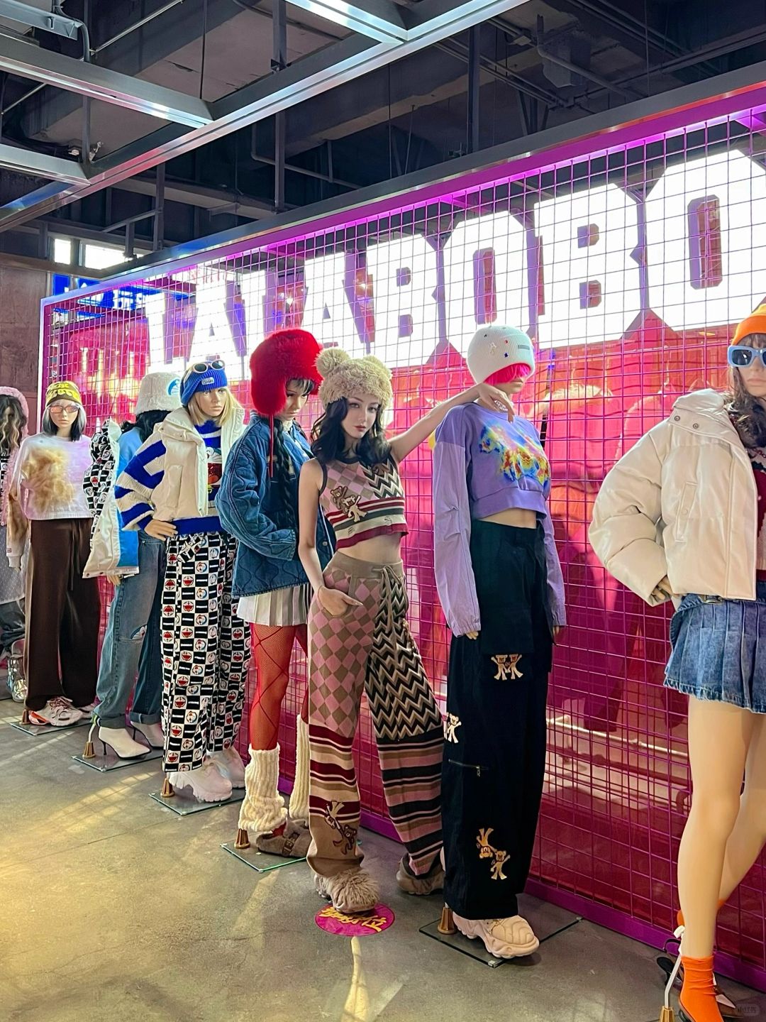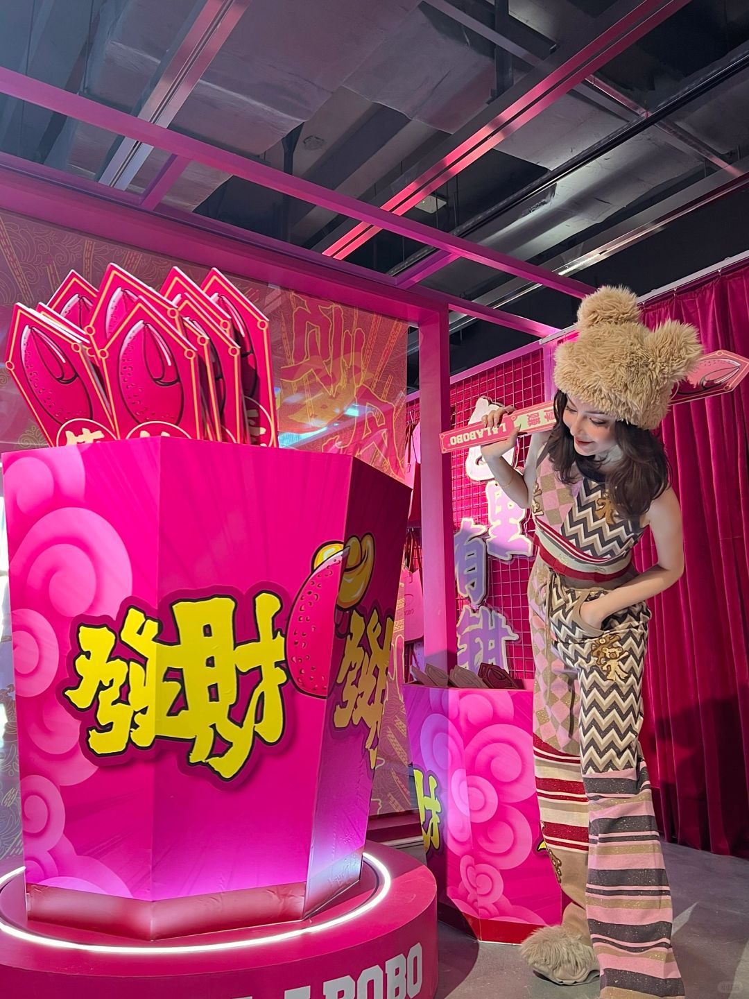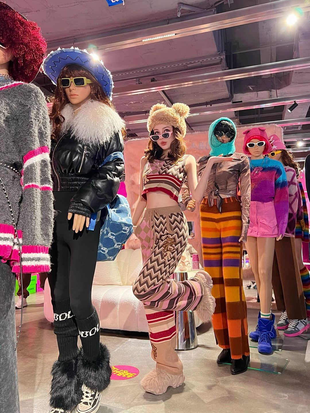 每周一次THE BOX! 2024新一年第一站 ——— 打卡LALABOBO!💖 好朋友拉着我逛,发现竟然出了黑色辣酷🕶风格。 上身的针织小套装🧥我一眼看中,偏复古辣妹风格,短款横条上衣和高腰裤设计超显腿长,搭配了同色系的小熊🐻帽子和毛毛鞋。 没有女生不喜欢粉色!粉色灯笼🏮的中式屋檐门头太好拍了,还有一列假人模特伙伴可以合影、现场还有互动小游戏和🧧利哦~