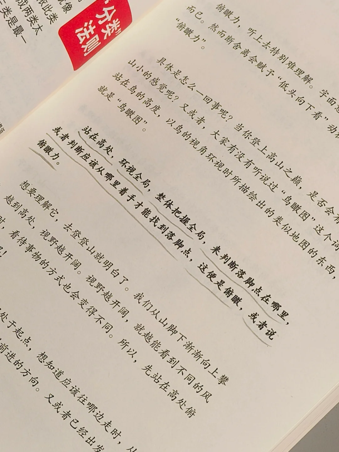 站在高处,环视全局,整体把握全局,来判断落脚点在哪里,或者判断应该从哪里着手才能找到落脚点,这便是俯瞰力。