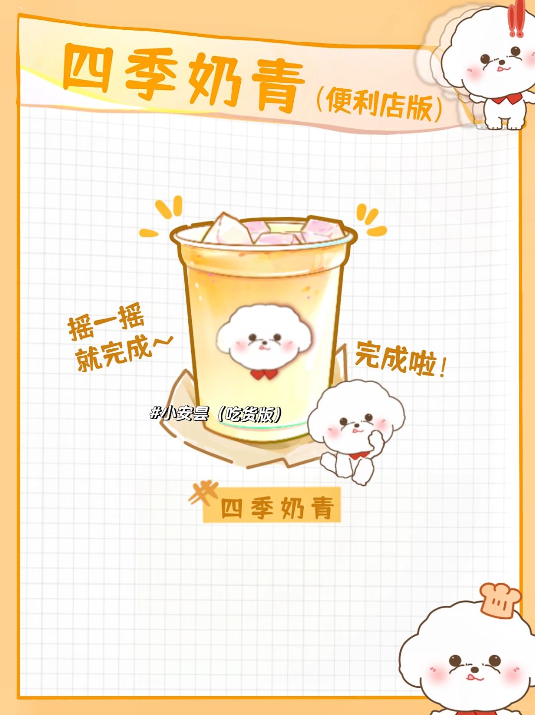 四季奶青(便利店版) 🥣材料准备 300ml茉莉蜜茶 ➕100ml纯牛奶➕适量冰块 🥣制作步骤 1⃣️首先将茉莉蜜茶喝掉一部分,在瓶子里加入100ml纯牛奶,疯狂摇晃! 2⃣️最后可以再加点冰块,摇晃均匀,饮品就完成了!超级方便哇!