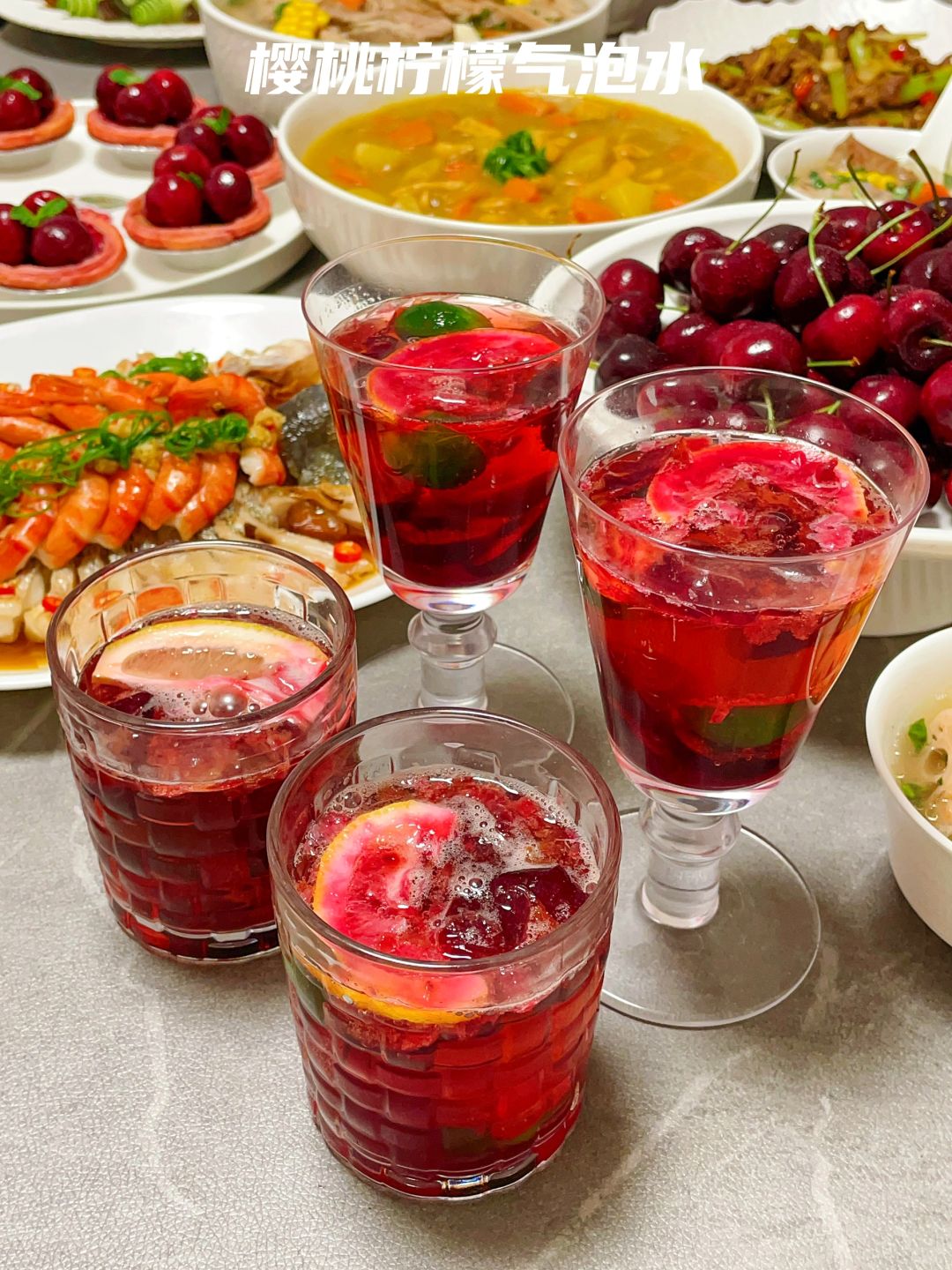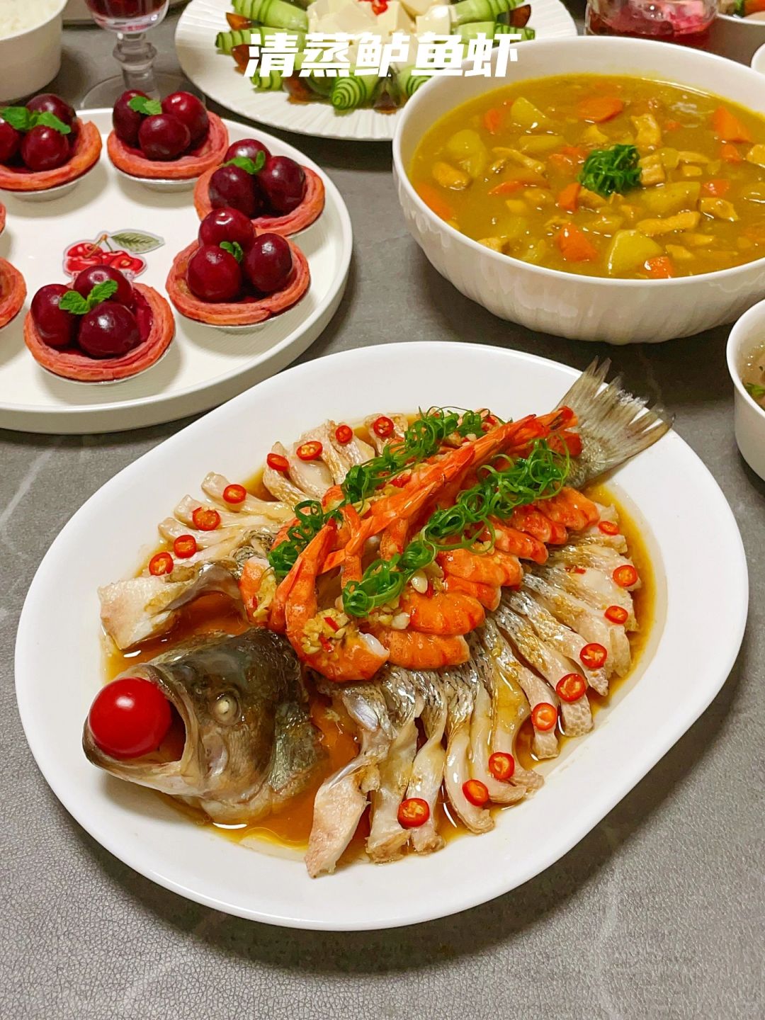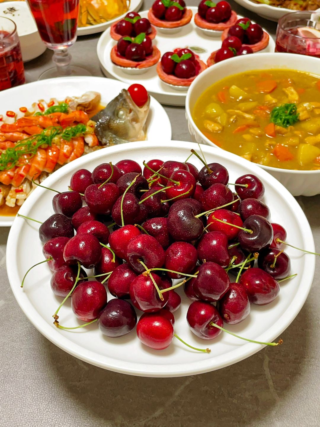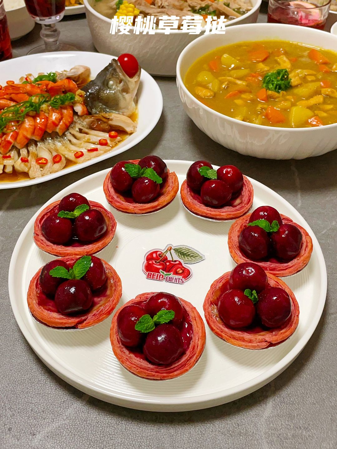 [集美R]今天也是充满过年气息的一桌菜,清蒸鲈鱼和蒜蓉虾搭配在一起也非常好吃,而且看着还富有仪式感。用刚到的樱桃做了樱桃挞和饮品,这个季节的塔斯马尼亚樱桃口感特好,单独吃或做成甜品都有不同滋味,做成饮品搭配海鲜和肉类,清爽解腻。对了,吃完螃蟹最好再炫杯姜汁水,温补一下。