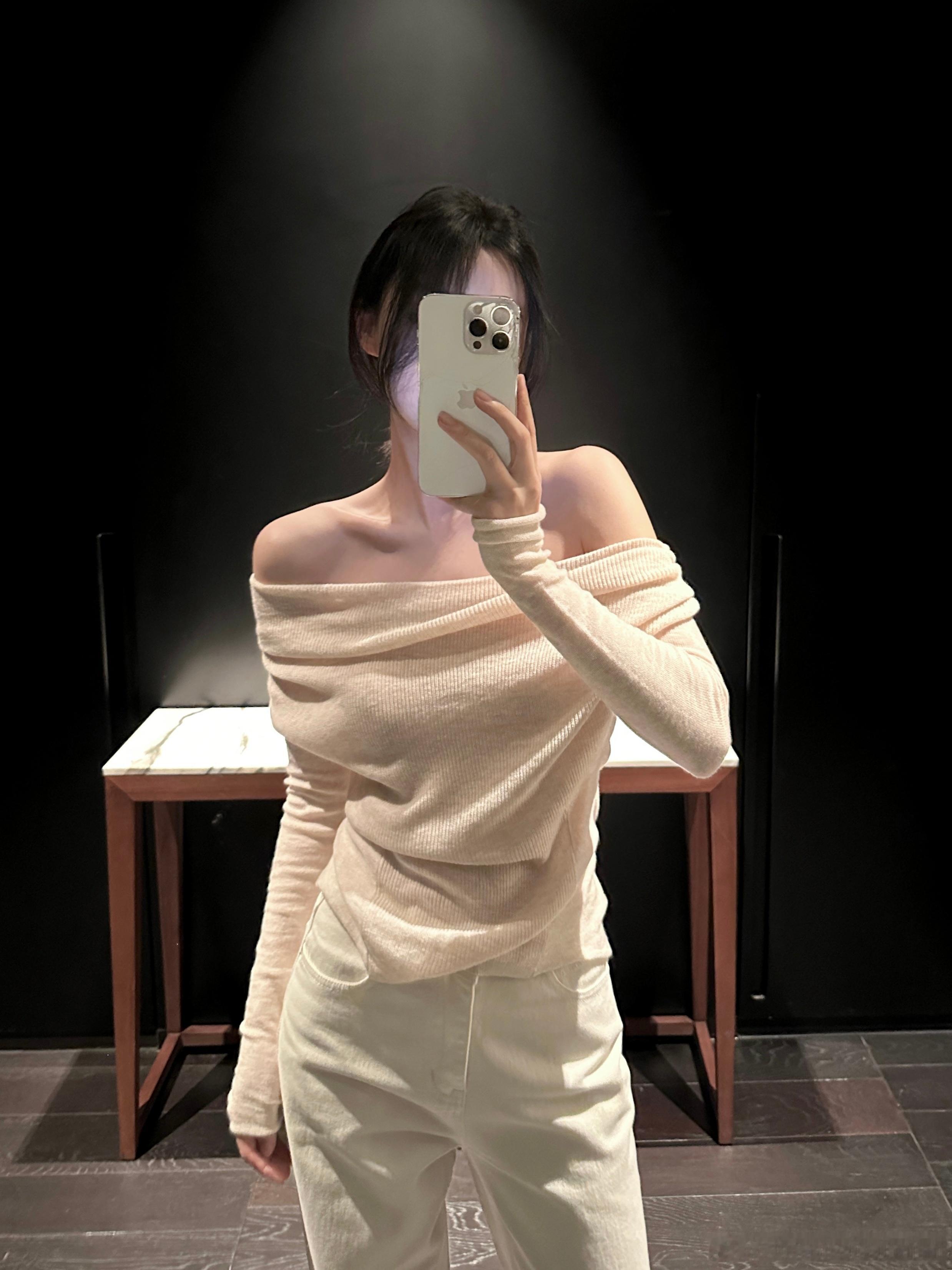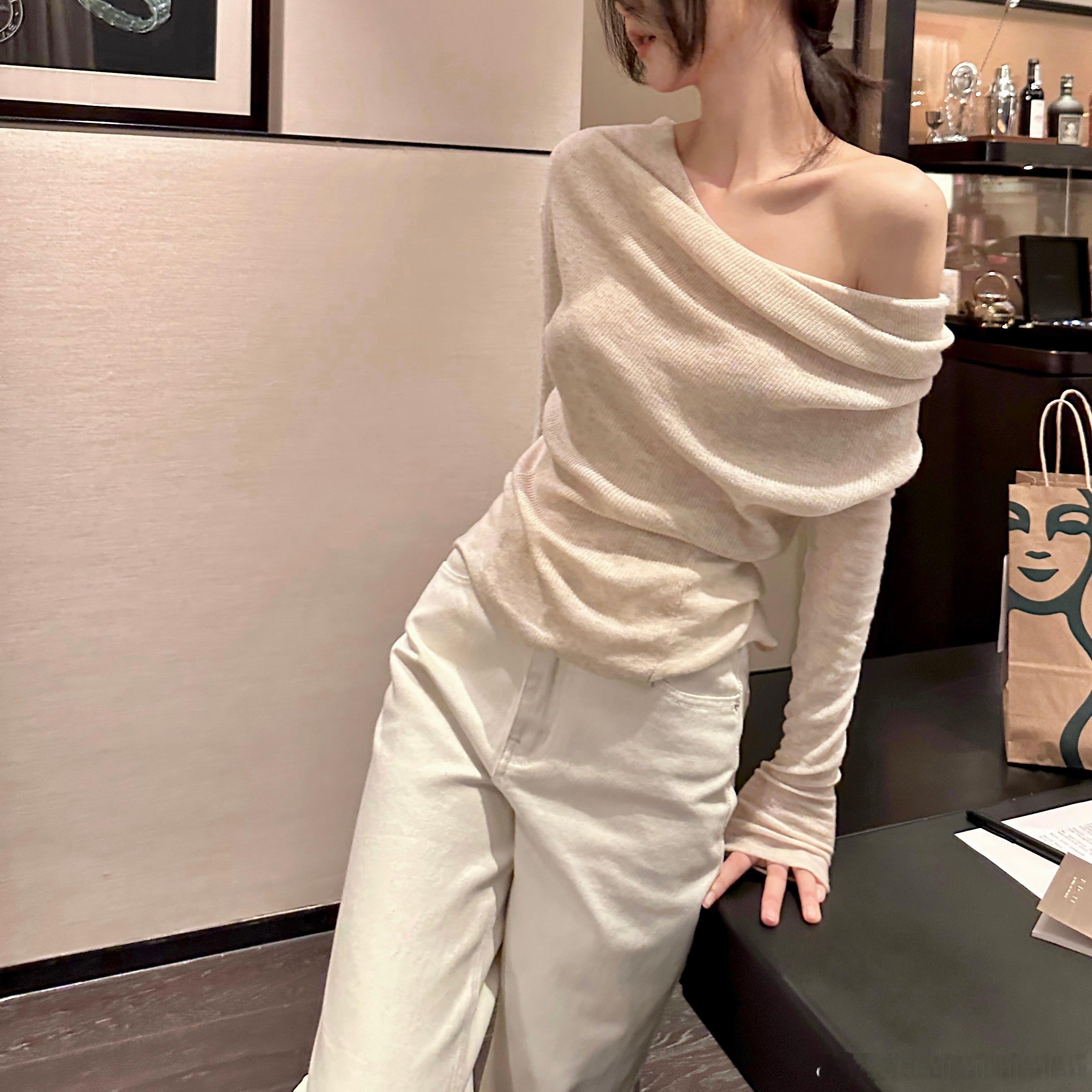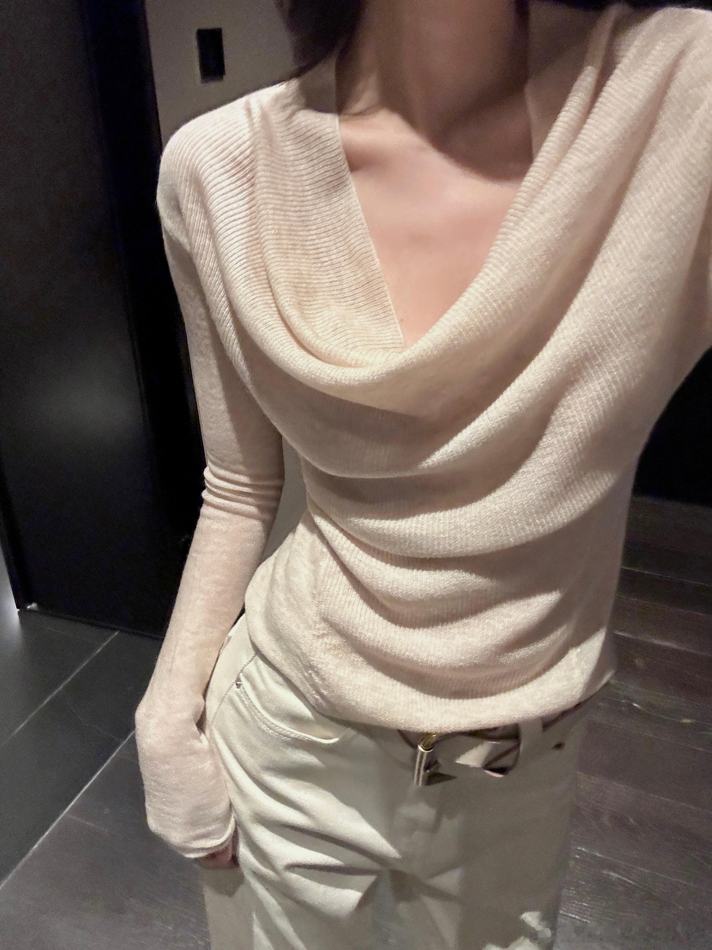 荡领的部分也可以拉下来穿 变成斜肩一字肩 稍微有一些薄透的感觉 织得太厚的话 就没有这种轻薄飘荡慵懒的感觉了
