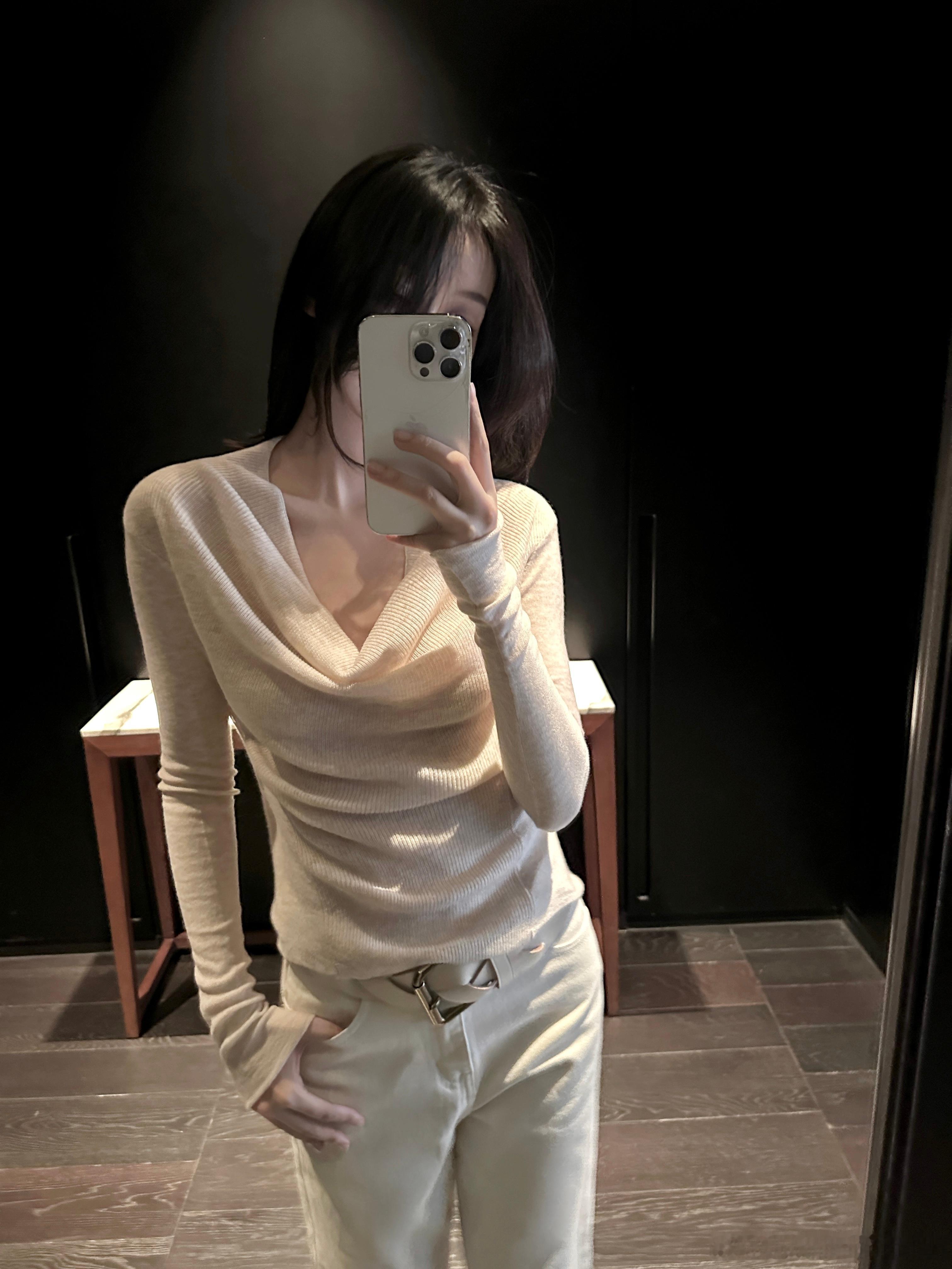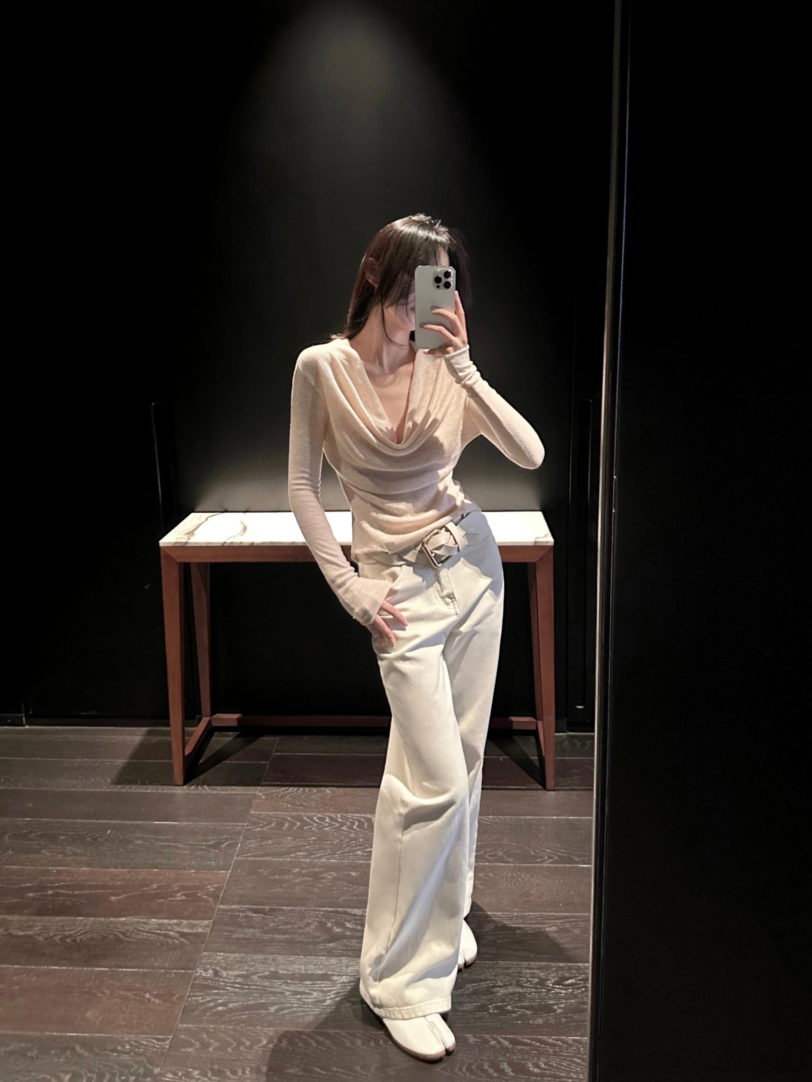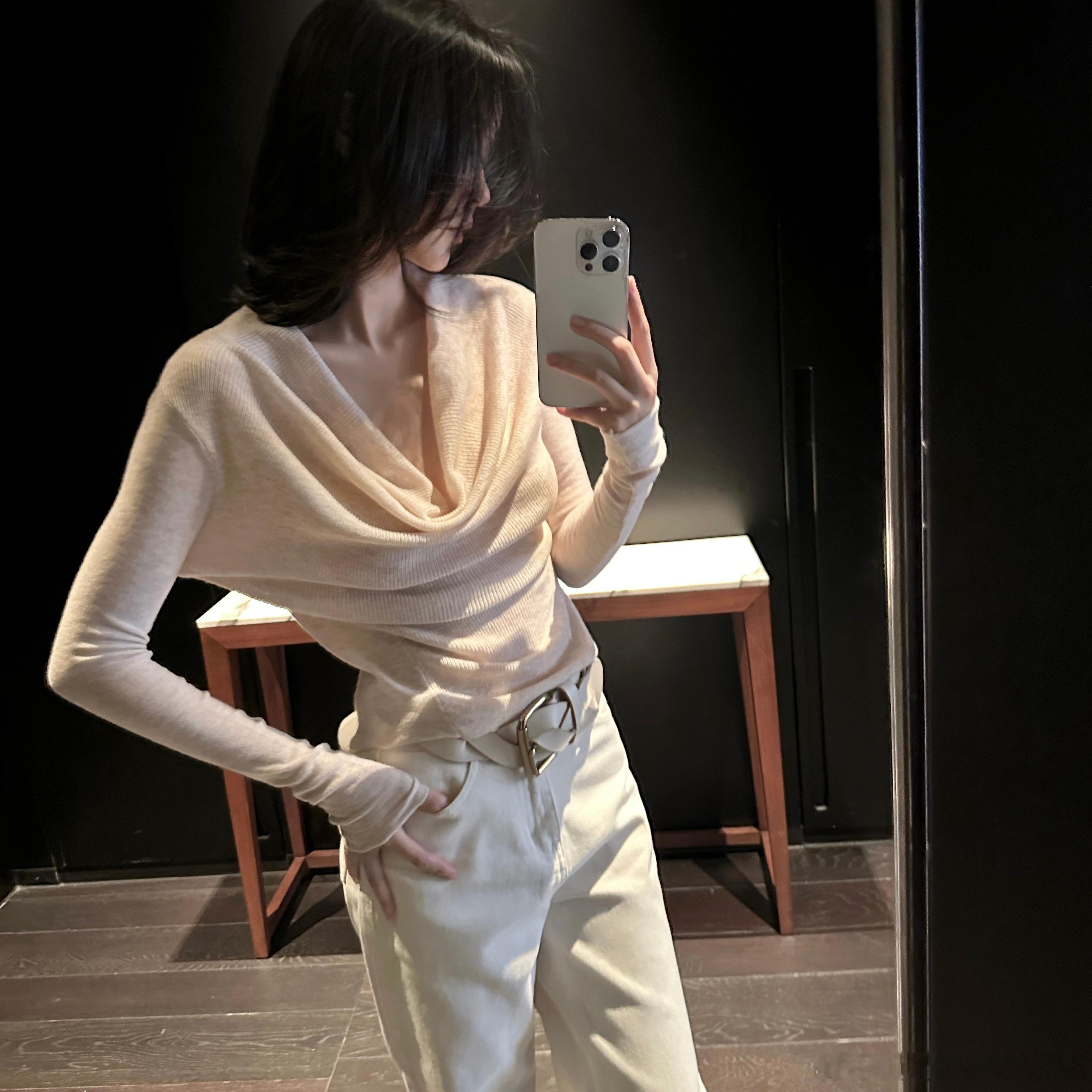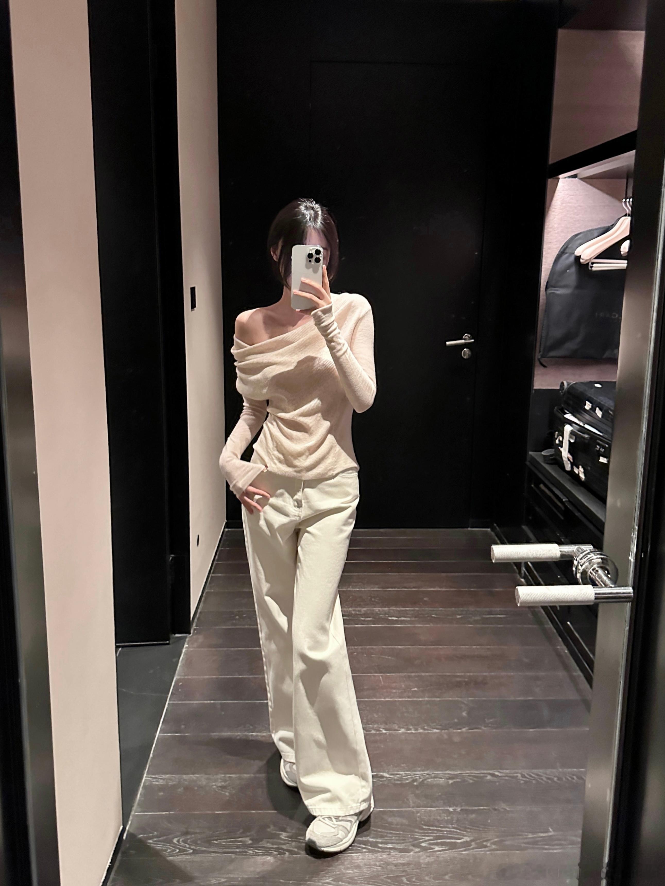 荡领的部分也可以拉下来穿 变成斜肩一字肩 稍微有一些薄透的感觉 织得太厚的话 就没有这种轻薄飘荡慵懒的感觉了