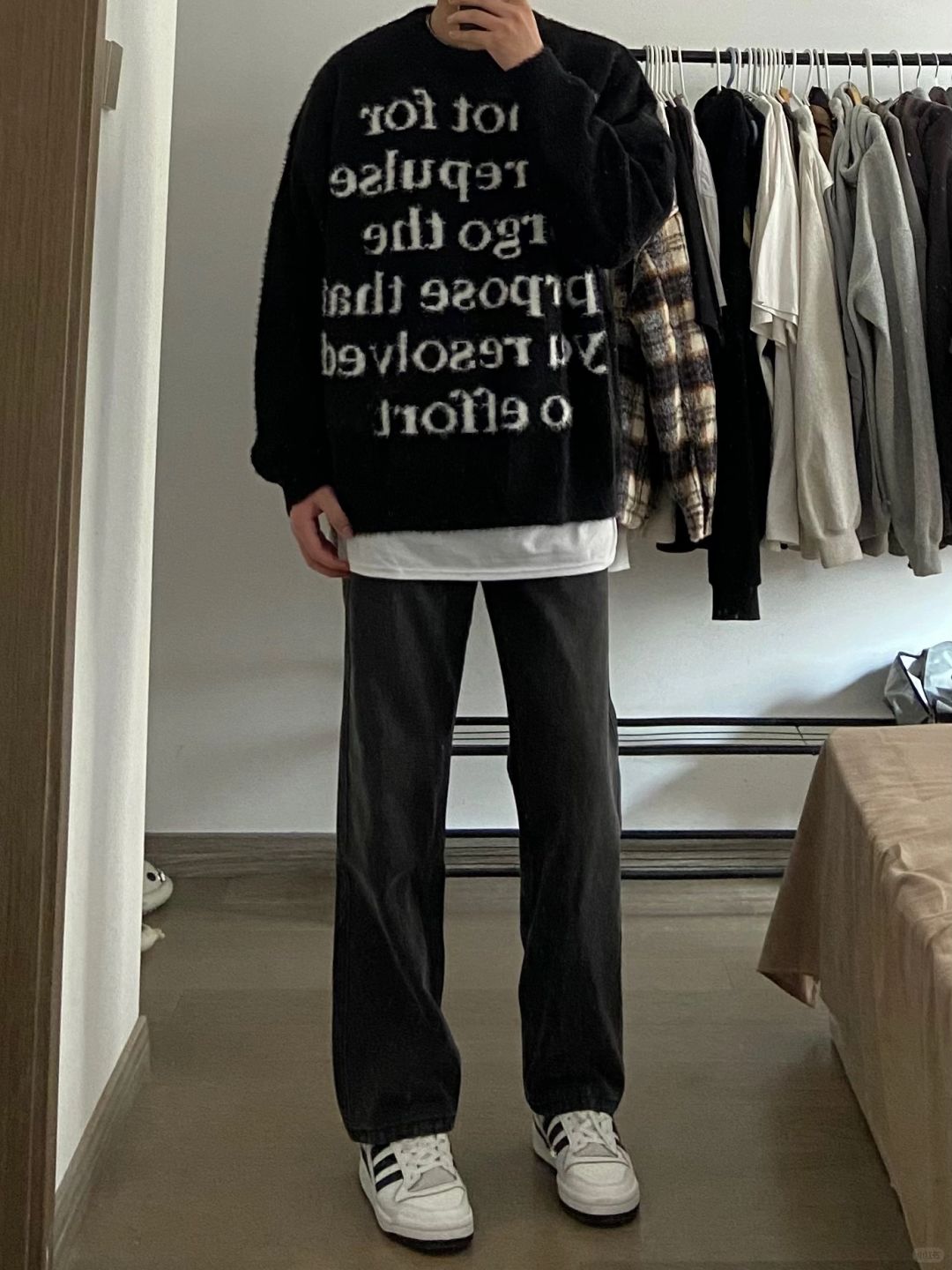 黑色圆领毛衣搭配烟灰色牛仔裤,舒适又好看!