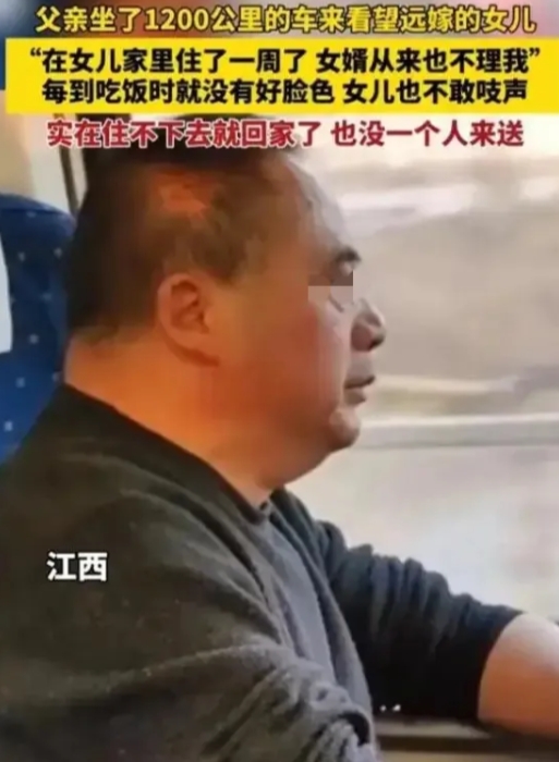 江西一位父亲行程1200公里去看远嫁的女儿,遭冷落,女婿对他不理不睬,女儿在家里没有一点地位,不敢反抗,小心翼翼两边讨好,看着女儿左右为难的样子,父亲心里是说不出的难受憋屈。