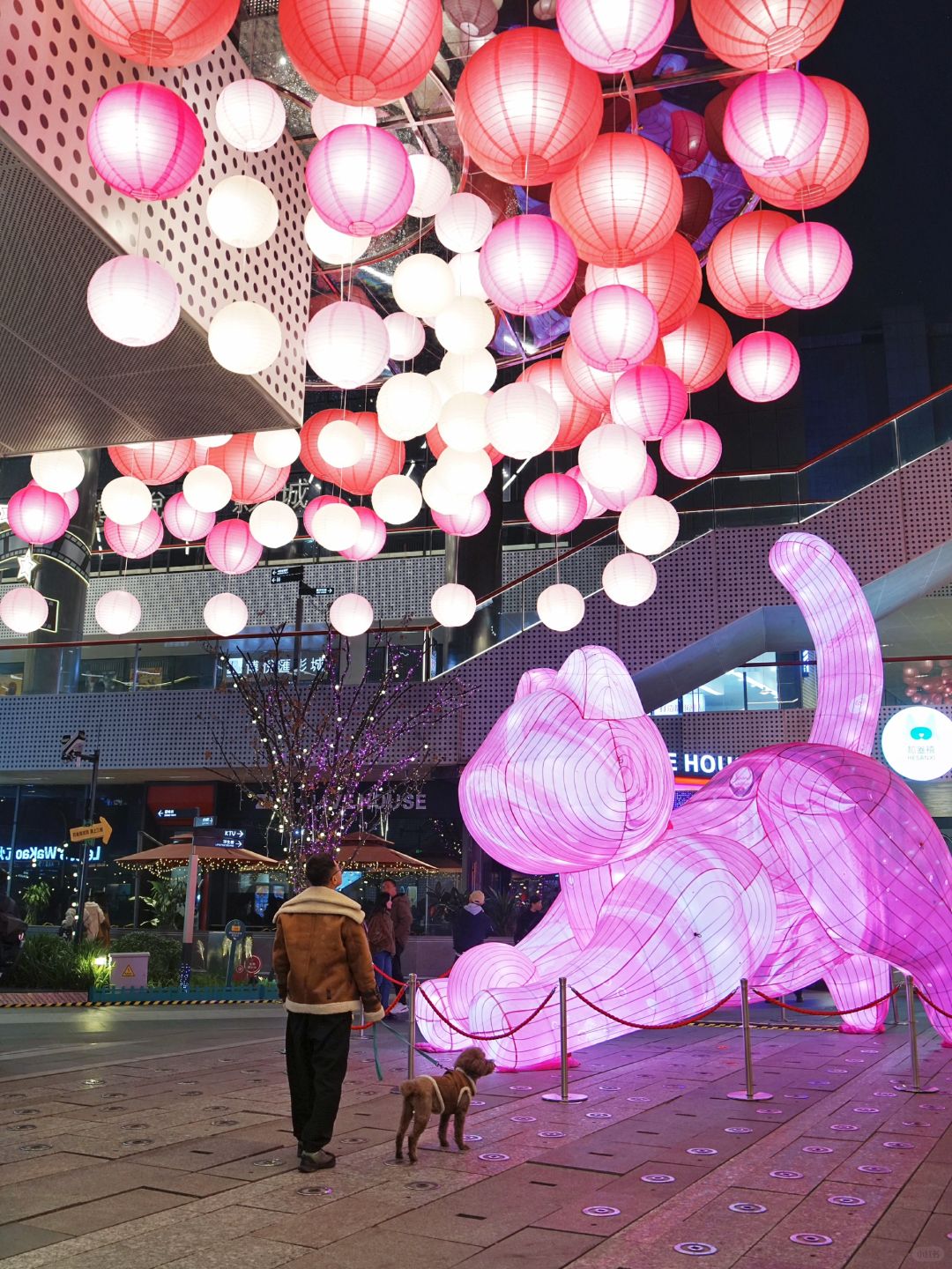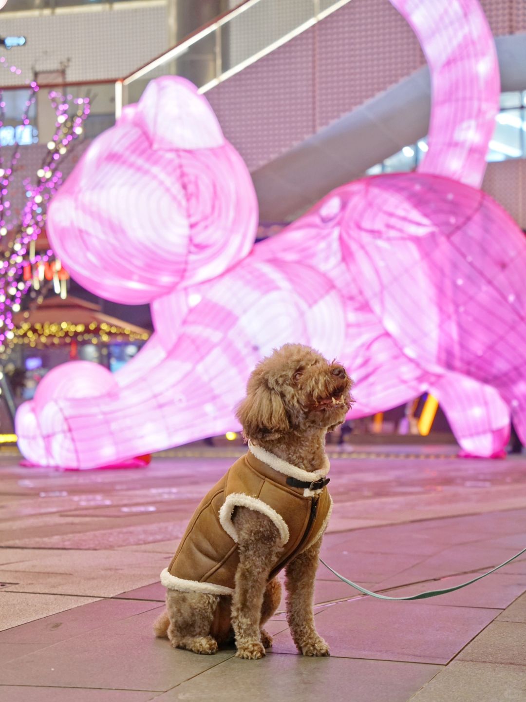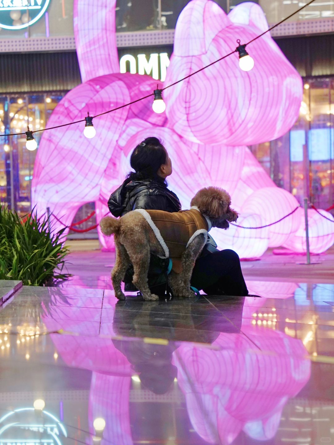 带狗子去商圈转转,你看这巨型的彩灯猫
