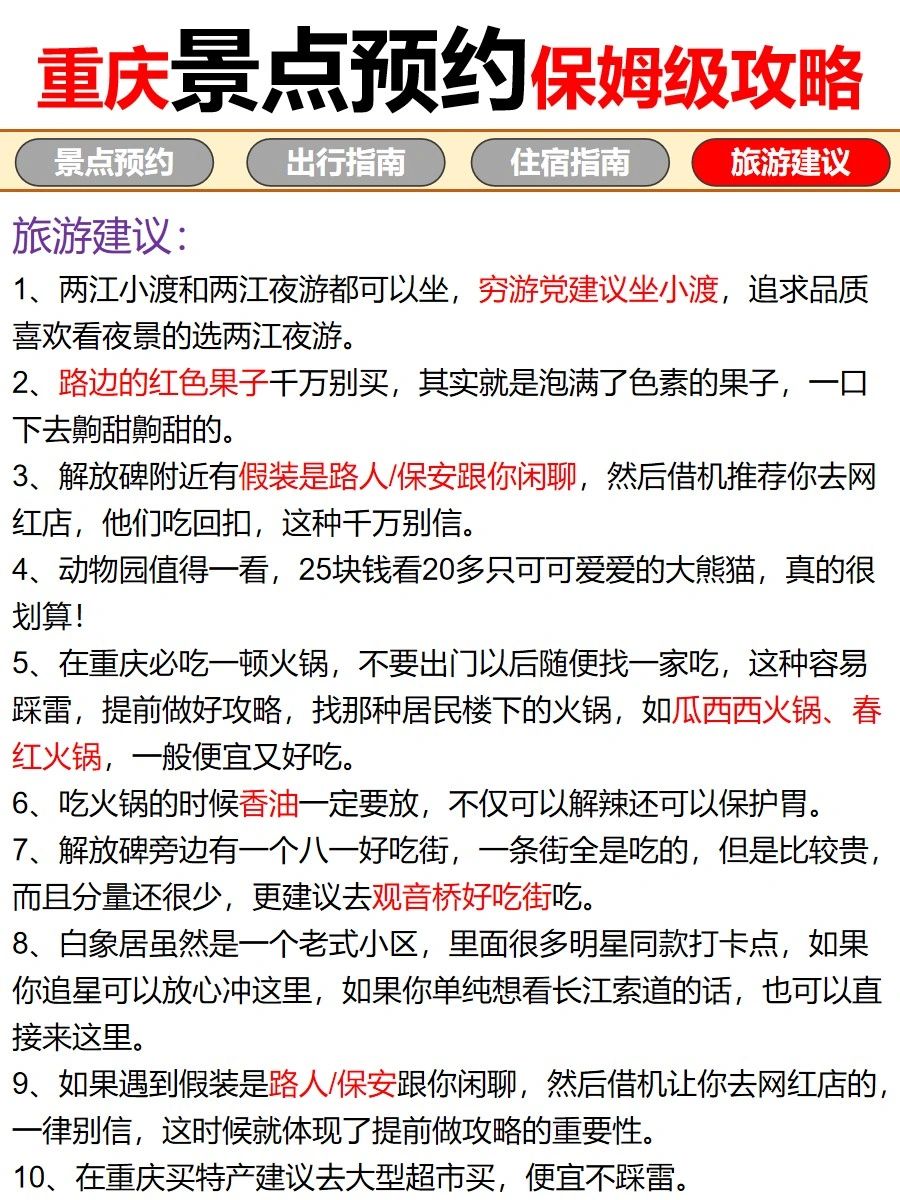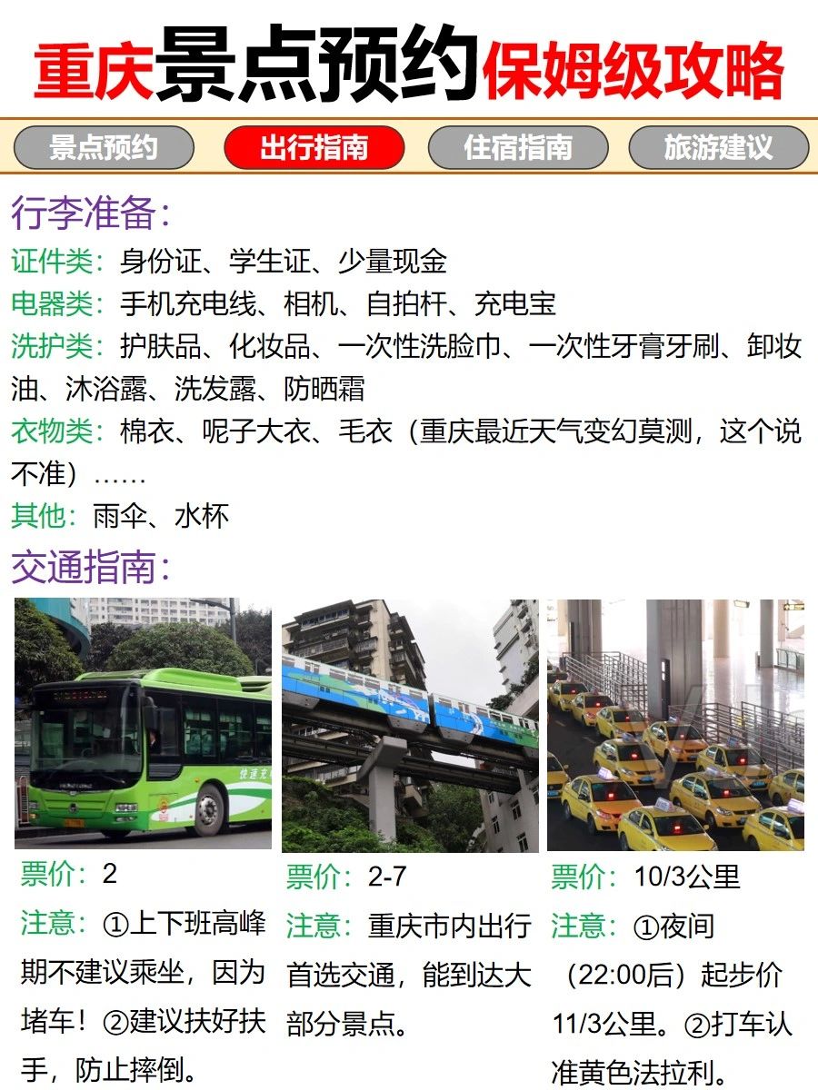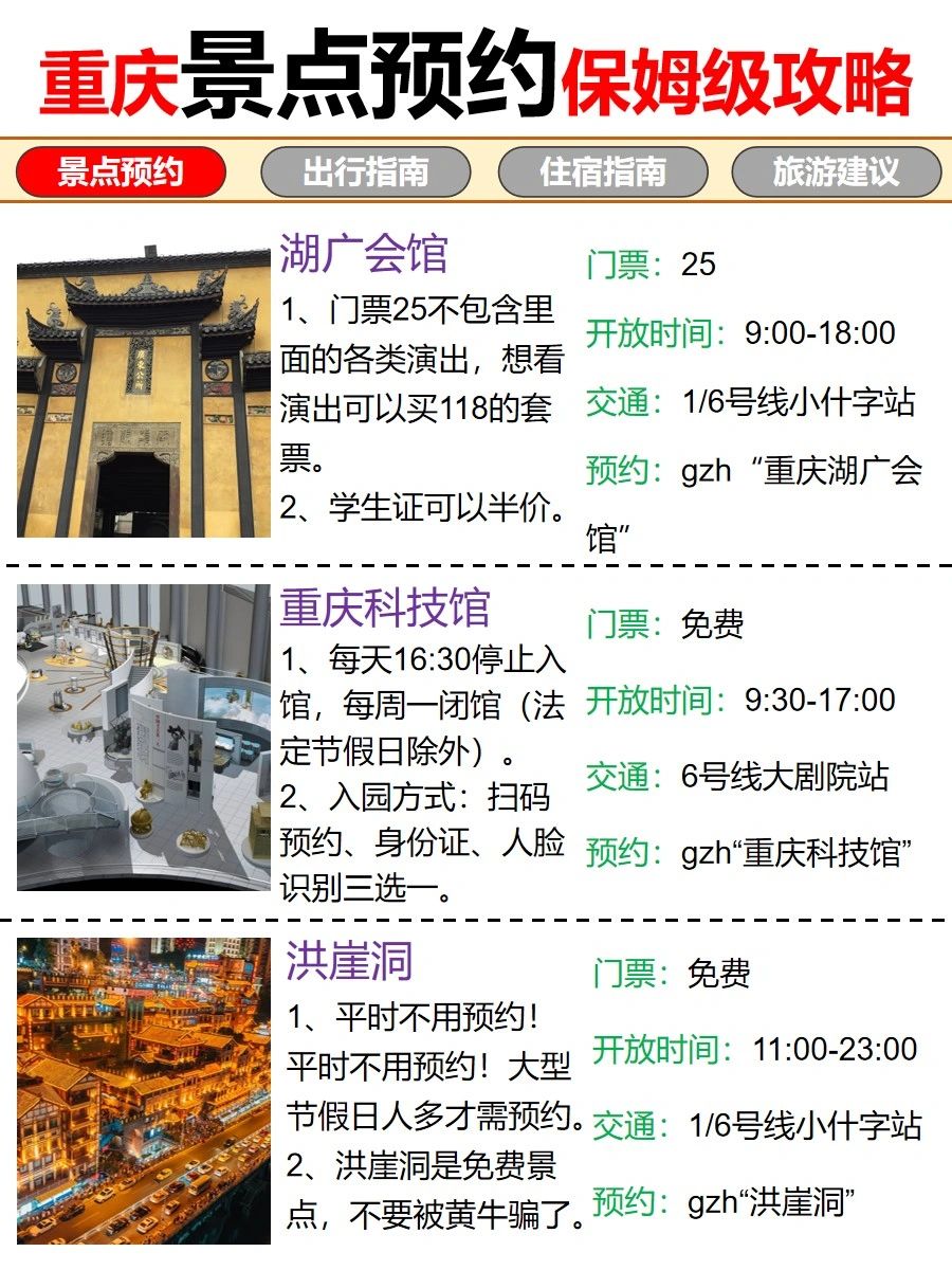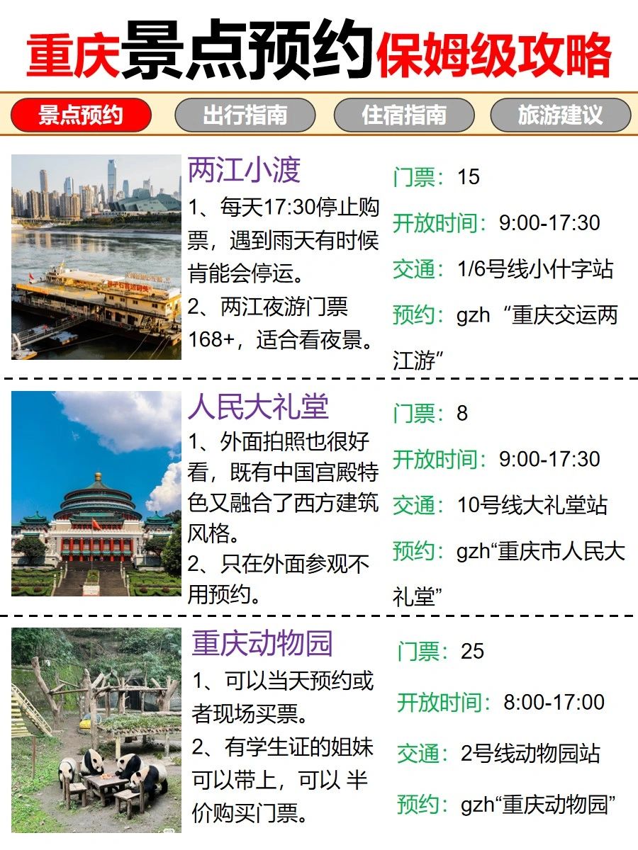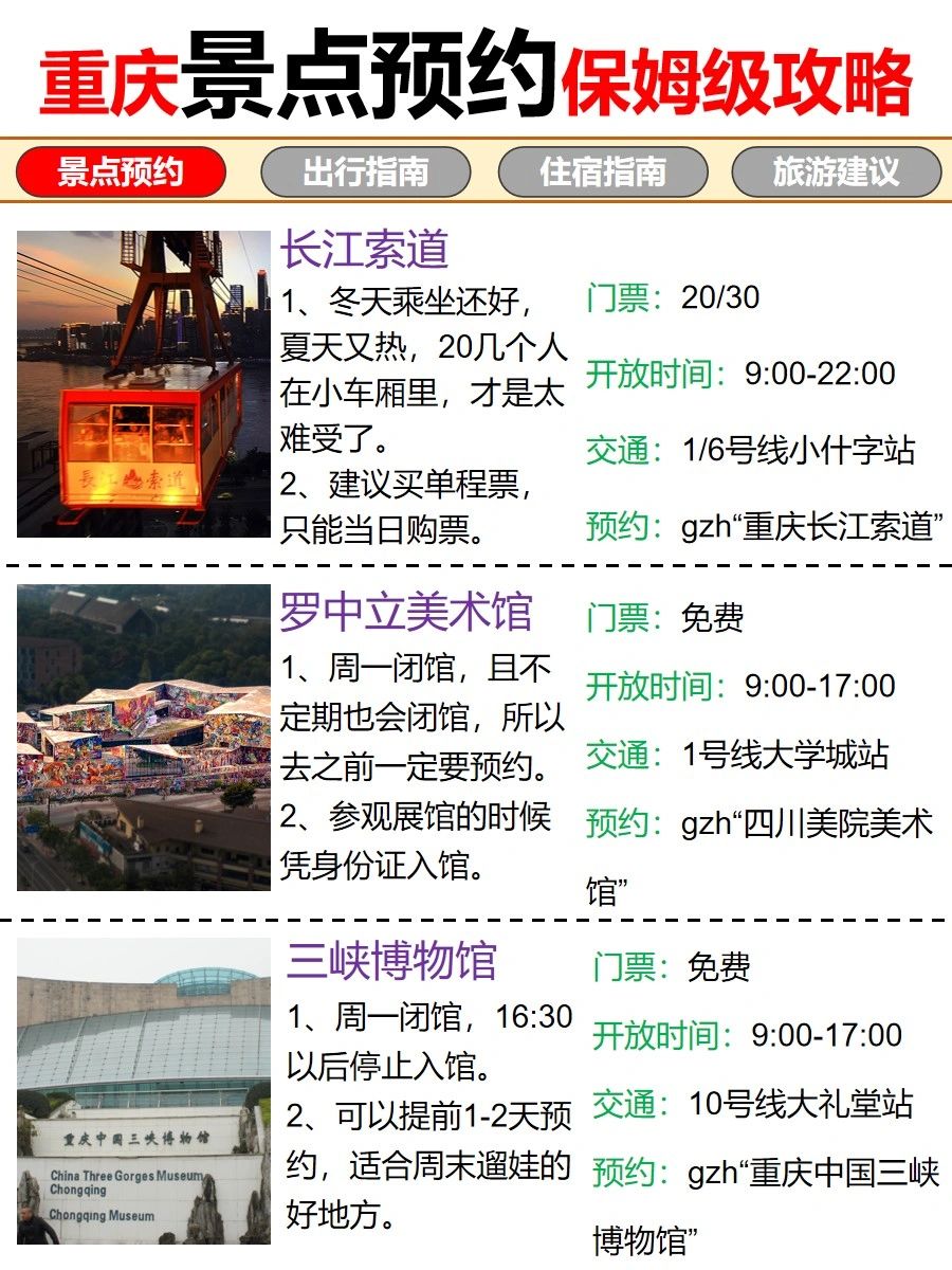 这个冬天还有想来重庆旅游的姐妹吗,再不预约就晚啦‼️接下来的重庆,现在已是寒假,接下来还有春节,将会有一大波人流涌入重庆,所以接下来要来重庆的姐妹一定要先预约‼️ - ✅需要预约的景点: 💙长江索道 💙罗中立美术馆 💙三峡博物馆 💜两江小渡 💜人民大礼堂 💜重庆动物园 💛湖广会馆 💛重庆科技馆 💛洪崖洞 - ✅更多详细细节请看图: 行李准备:P5 交通指南:P5 住宿指南:P6 旅游建议:P7-8