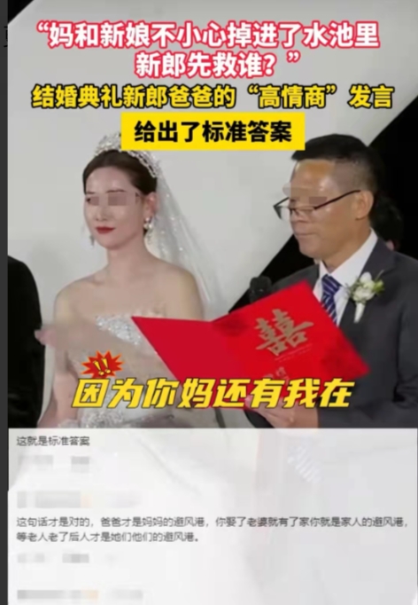 婚礼上提送命题,明显是安排的戏码。能说明什么问题?这场合看不出大格局,只能是小聪明。如果以后还有人再效仿,那只能是愚蠢。[狗头]