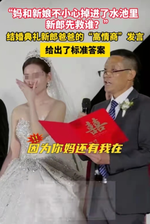 真是大格局!四川内江,一个婚礼现场,新郎的母亲万万没有想到,在儿子面对母亲和妻子跳河先救谁的这个问题上,她的丈夫竟然告诉儿子:不要管你妈,你要毫不犹豫地去救新娘。 婚礼现场,高朋满座,大家翘首相望,台上站着美丽的新娘,帅气的新郎,公公婆婆,岳父岳母,大家面对一对新人完成人生中重要的礼仪,纷纷投去祝福。 到了父母发言的环节,大家更是激动了,更让人激动的是,新郎父亲的一番说辞,让大家知道这位父亲通情达理,大格局,这位新娘嫁得好。 新娘更是没想到,公公竟然在丈夫对待妈妈和妻子跳河的这个问题上,给出了明确的态度,让她感到很温暖,甚至热泪盈眶。 新郎父亲说:在这里,我特别想对儿子说,如果有一天,你妈和新娘不小心掉进水里,我希望你毫不犹豫的跳下去,把新娘救起来,不要管你妈,因为你妈还有我在。 听了这句话,新郎内心的责任感由然升起,爸爸用自己的实际行动告诉了他,结婚以后要以小家为主要,以妻子为主。 他知道,父亲用这一句话告诉他,一旦母亲和妻子起争执或者矛盾,他站在妻子的角度,呵护妻子,而他妈妈的问题,由他爸爸解决。 新娘听了公公的这一番话,也知道了丈夫的家教,公公如此,想必当年也是受过教育而来的,今天他如此教自己的儿子,新娘觉得,以后自己应该不会在婆家受委屈。 新郎的妈妈,当她听到丈夫站在儿媳妇的角度护着儿媳妇,却把责任揽到自己身上,她也明白,丈夫在告诉她,儿子结婚之后,不要干涉小两口的事情,以免儿子难做人。 而新娘的父母,看到这位亲家如此大格局,如此在众人面前表明了态度,他们明白,以后自己的女儿在婆家要是有了矛盾,会有一个明事理的公公出来维持局面,父亲如此,想必新郎也不会差到哪里去。