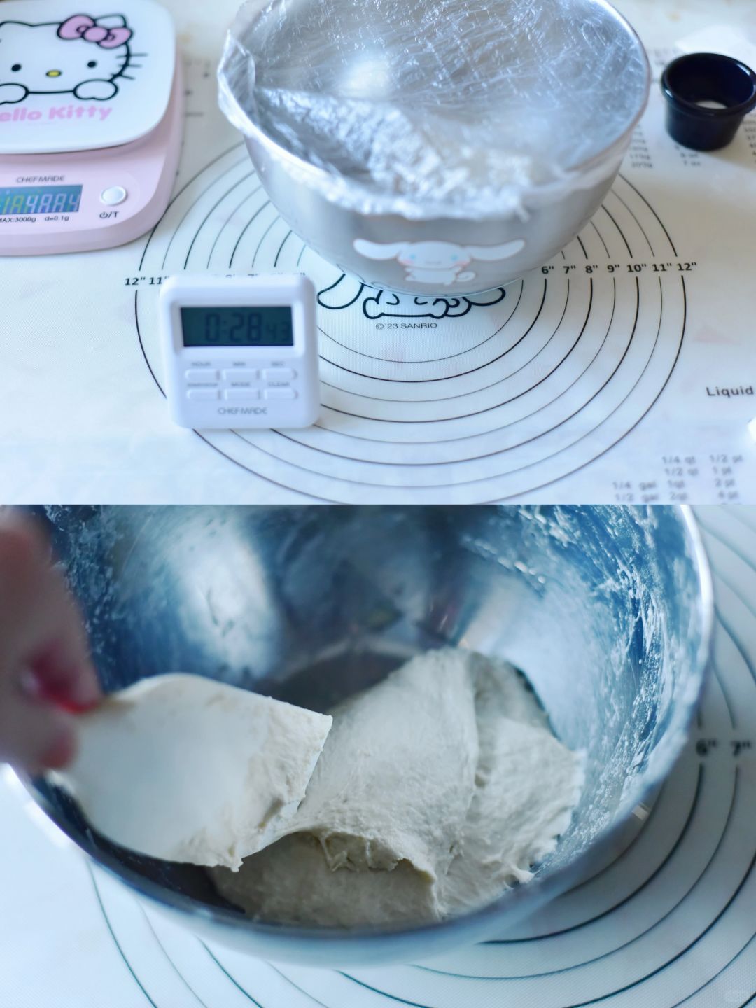 4半小时后再次折叠醒发,再过半小时最后一次折叠。醒发至2.5倍大。