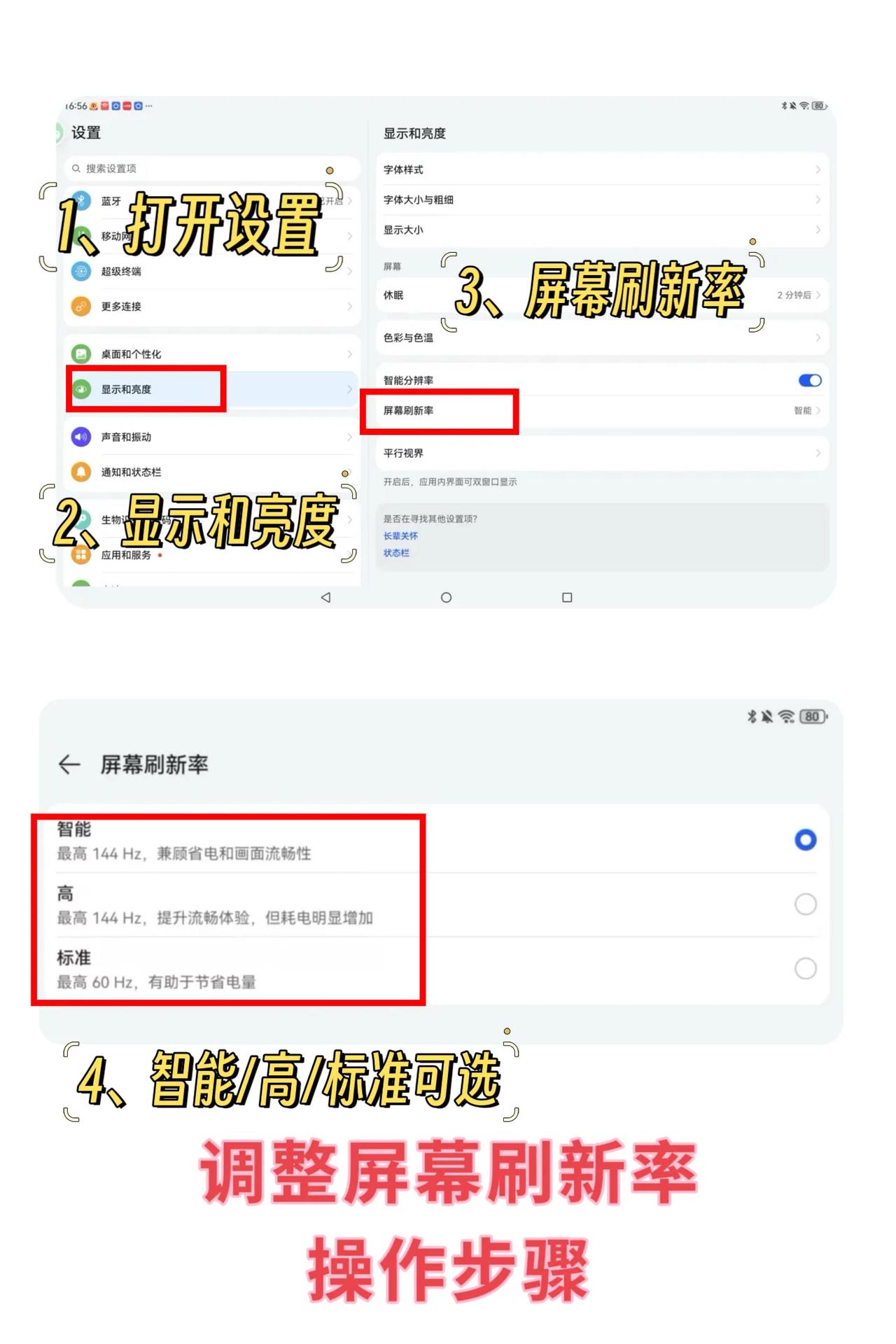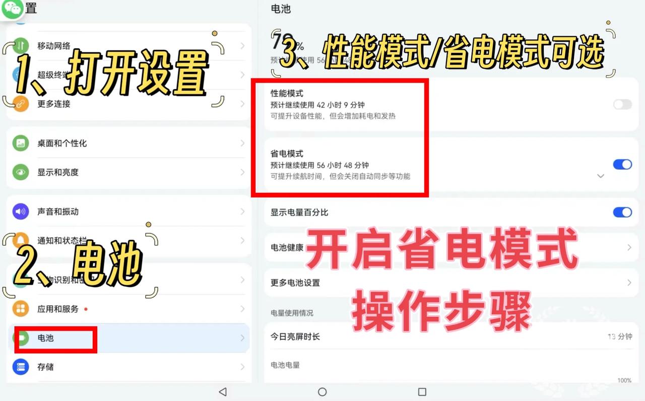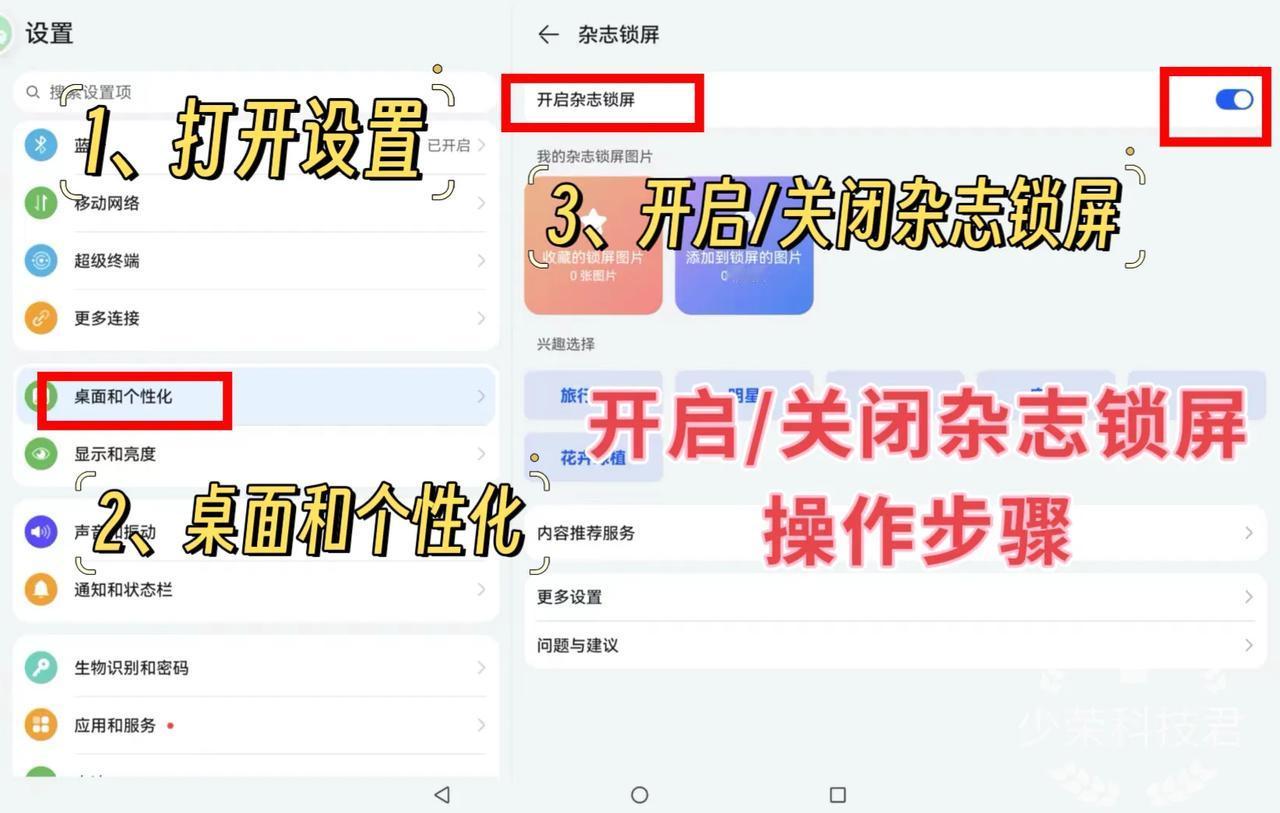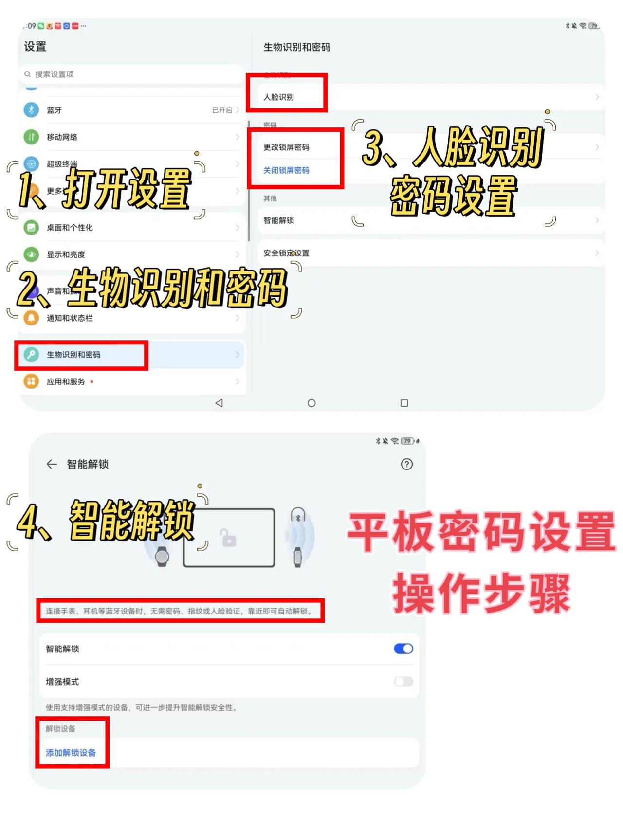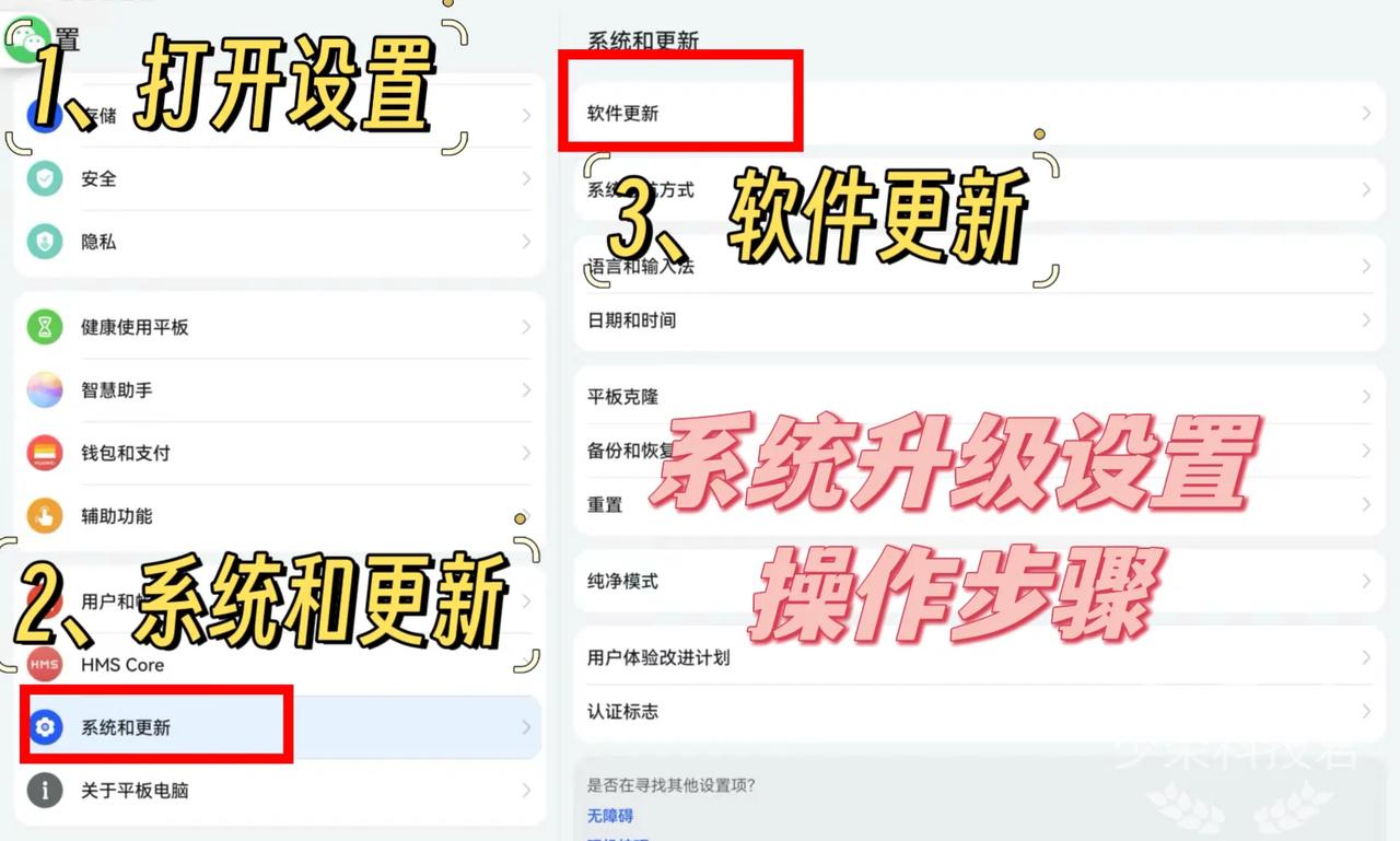 1、华为平板密码设置操作步骤 设置-生物识别和密码-人脸识别/密码设置-智能解锁 在智能解锁功能中,可以添加解锁设备,连接手表、耳机等蓝牙设备时,靠近即可解锁; 2、调整屏幕刷新率操作步骤 设置-显示和亮度-屏幕刷新率-智能/高/标准模式可选 智能模式最高144Hz,自动调节更实用; 高模式最高144Hz,流畅但是耗电; 标准模式最高60Hz,比较省电; 3、开启省电模式操作步骤 设置-电池-开启省电模式/性能模式 4、系统升级操作步骤 设置-系统和更新-软件更新 5、开启/关闭杂志锁屏操作步骤 设置-桌面和个性化-开启/关闭杂志锁屏