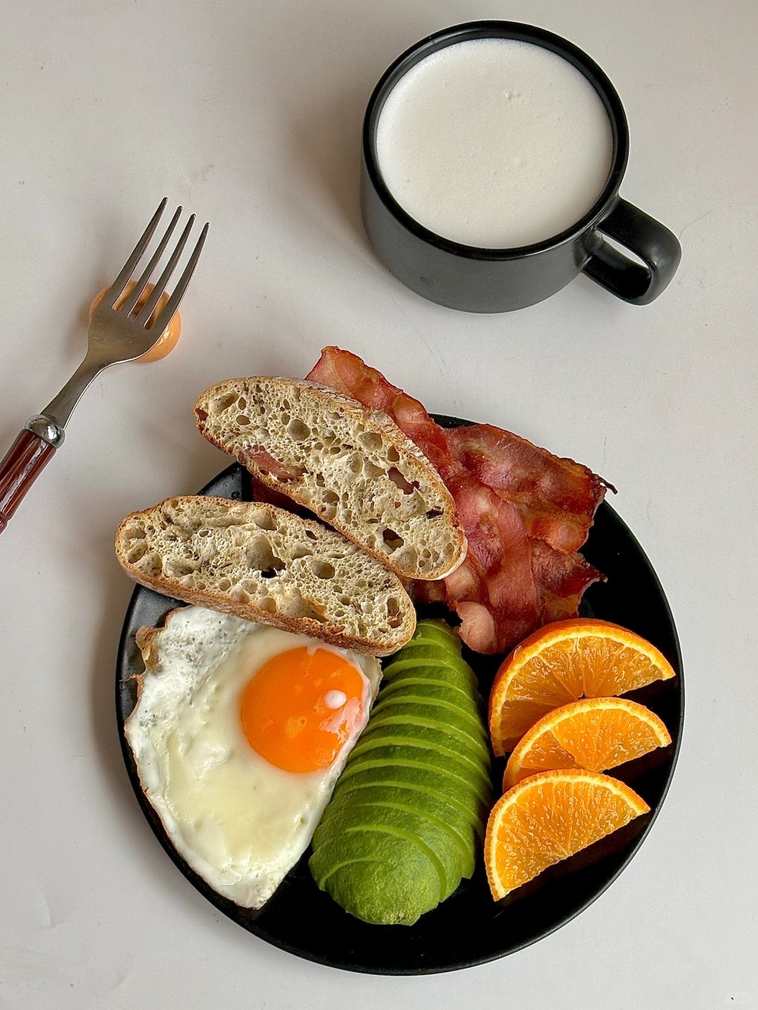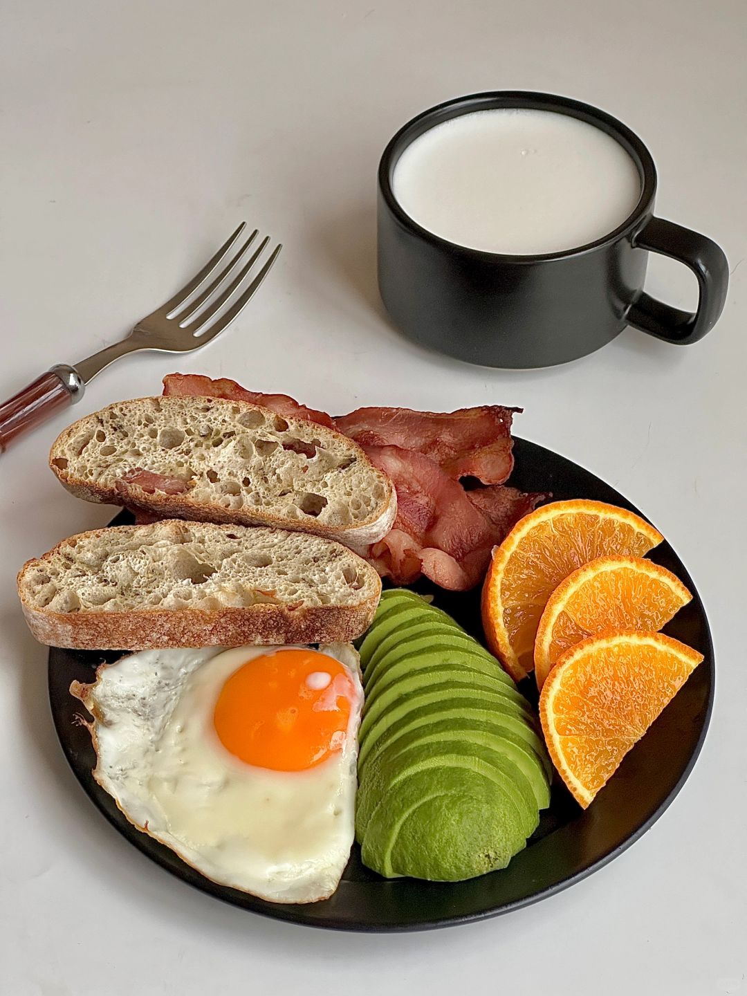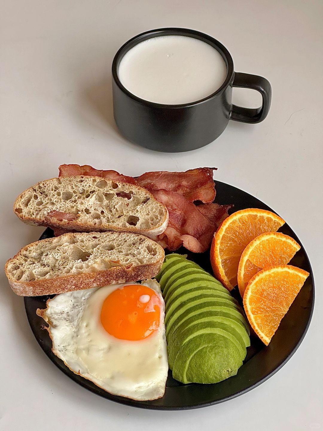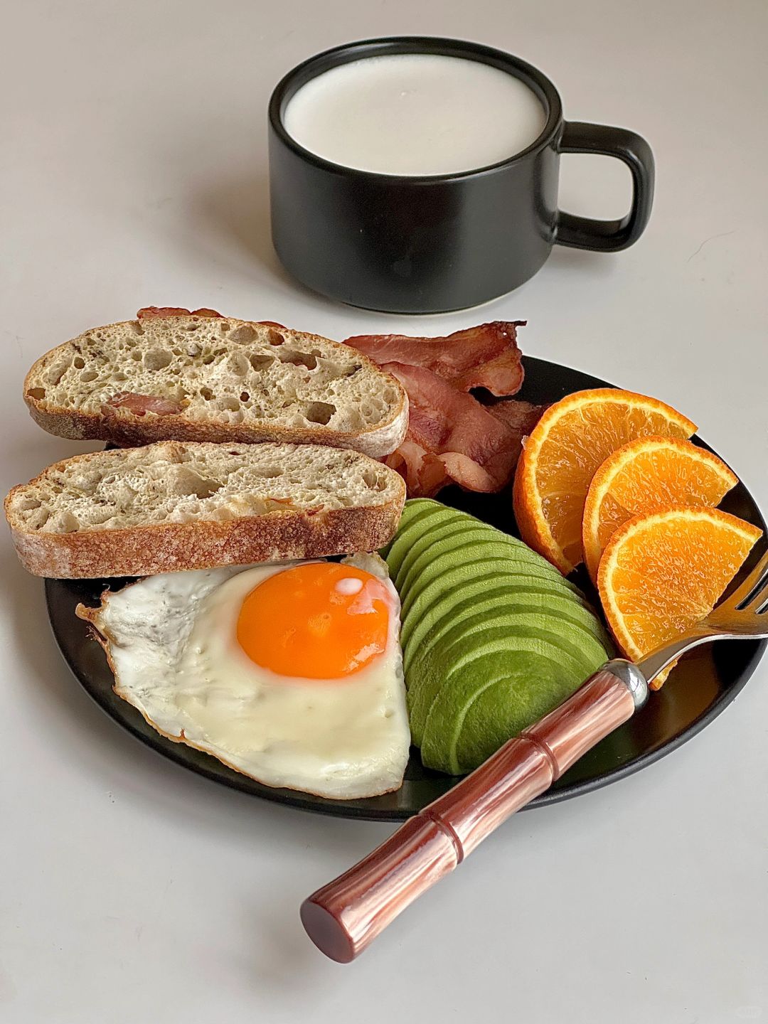 一人食吃什么 今日份早餐是营养满满的早餐盘 恰巴塔|煎蛋🍳|牛油果🥑|培根🥓|橙子🍊 搭配一杯热牛奶 十分钟就能搞定的快手早餐太🉑️了
