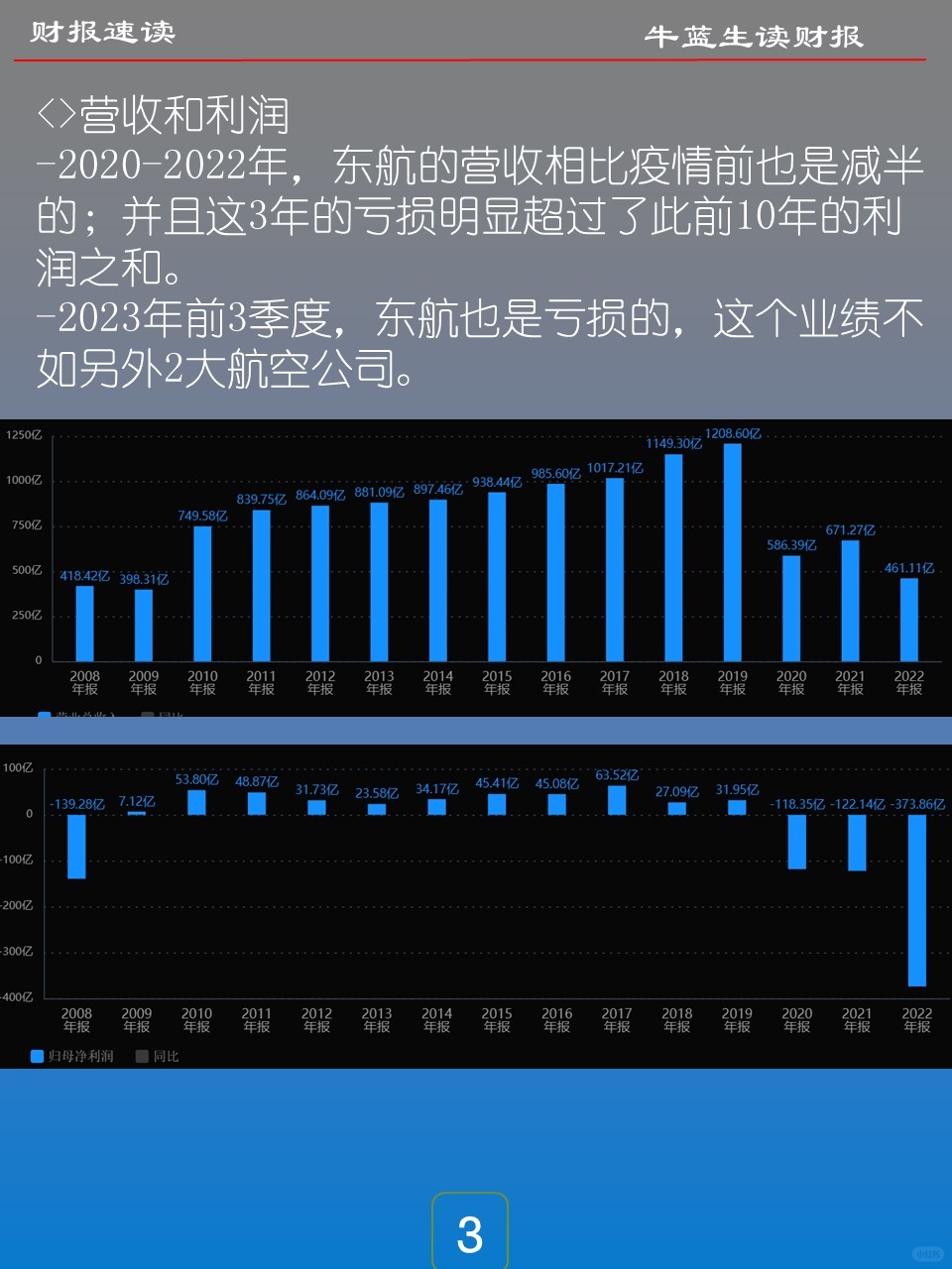 -2020-2022年,东航的营收相比疫情前也是减半的;并且这3年的亏损明显超过了此前10年的利润之和。