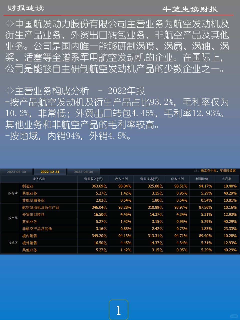 -按产品航空发动机及衍生产品占比93.2%,毛利率仅为10.2%,非常低;外贸出口转包4.45%,毛利率12.93%。其他业务和非航空产品的毛利率较高。