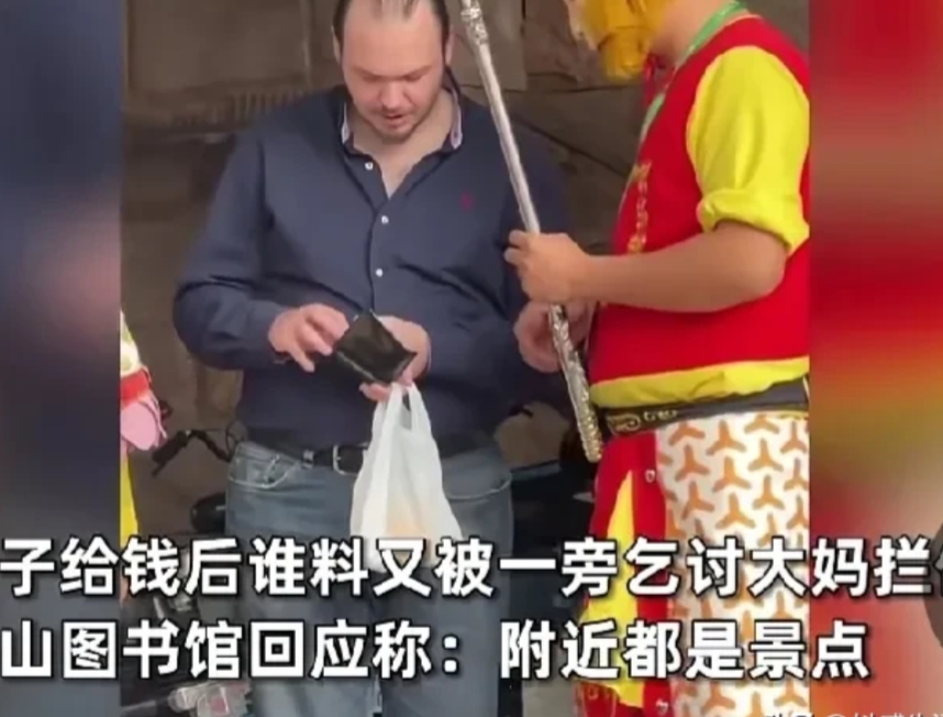 广东佛山,街头发生一件不知耻的事。一名外国友人被两名“猴哥”扮演者拉着拍照,完事之后索要红包。外国友人一开始面露喜悦,可随着后面的讨要行为,脸上的笑容逐渐消失。
