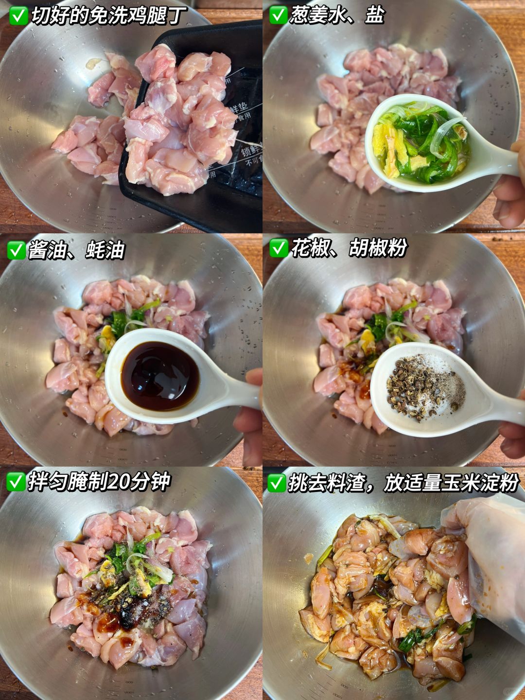 1、鸡腿肉丁放葱姜水、一勺生抽、少许老抽、蚝油、盐、花椒、胡椒粉拌匀腌制20分钟;