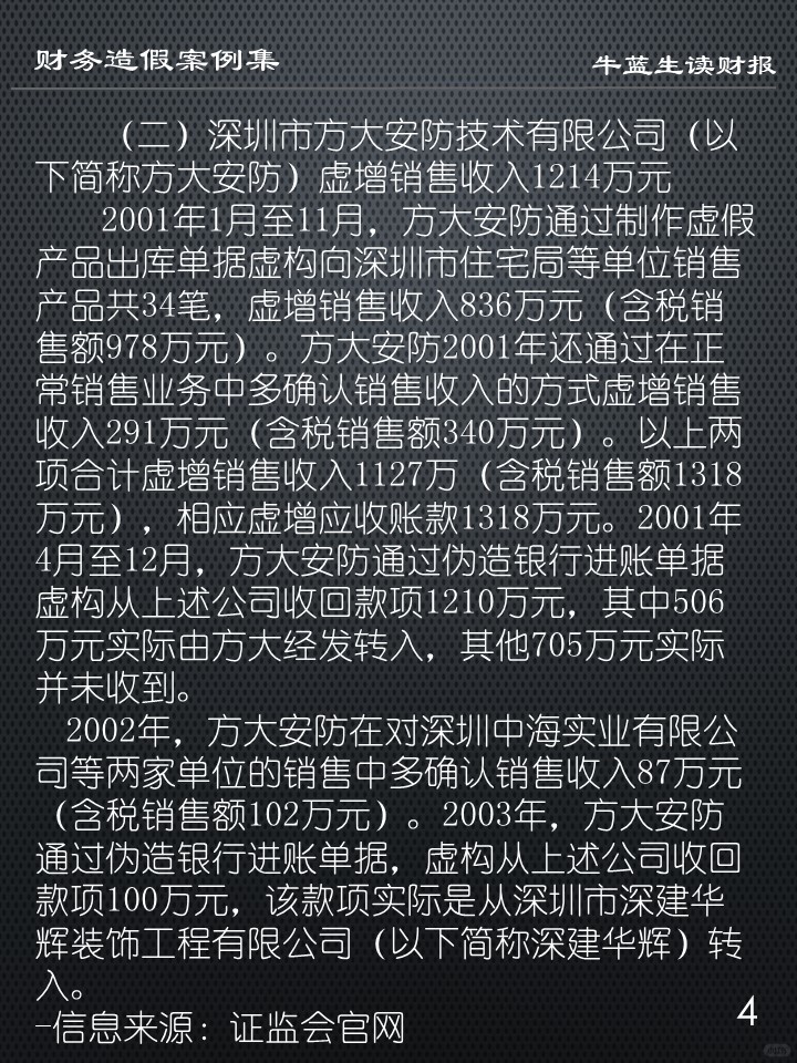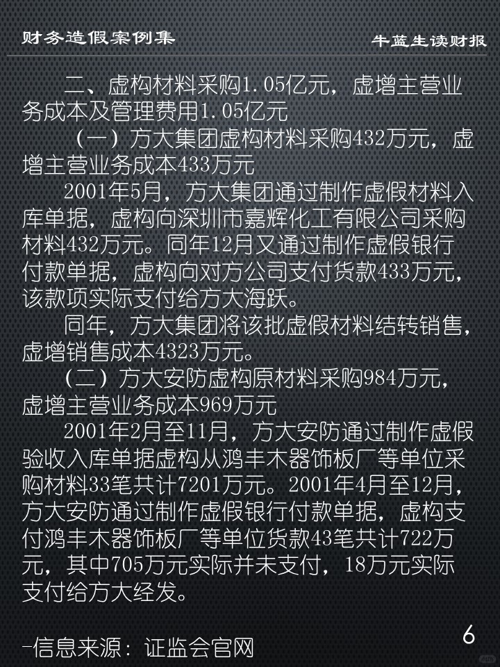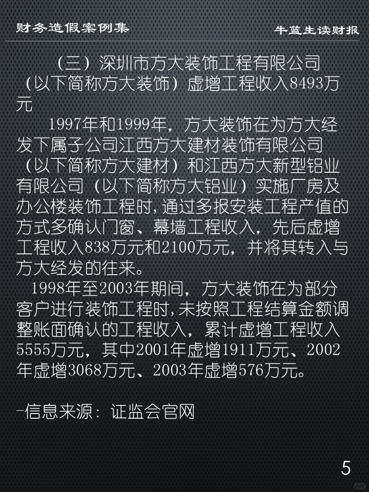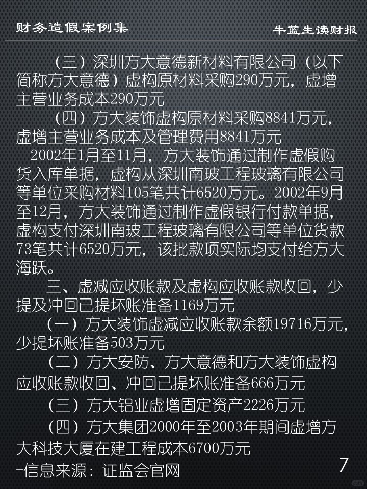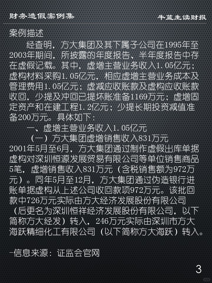✈公司:方大集团 造假金额:1995-2003年虚增营业收入1.05亿元元,虚增固定资产和在建工程1.2亿元,等 主要手段:制作虚假出库单据虚构销售,等 证监会处罚文号:[2006]18号 后果:公司及相关人员被处罚。