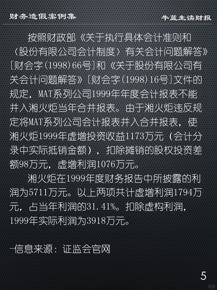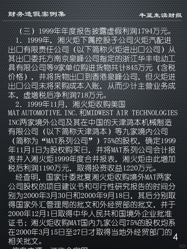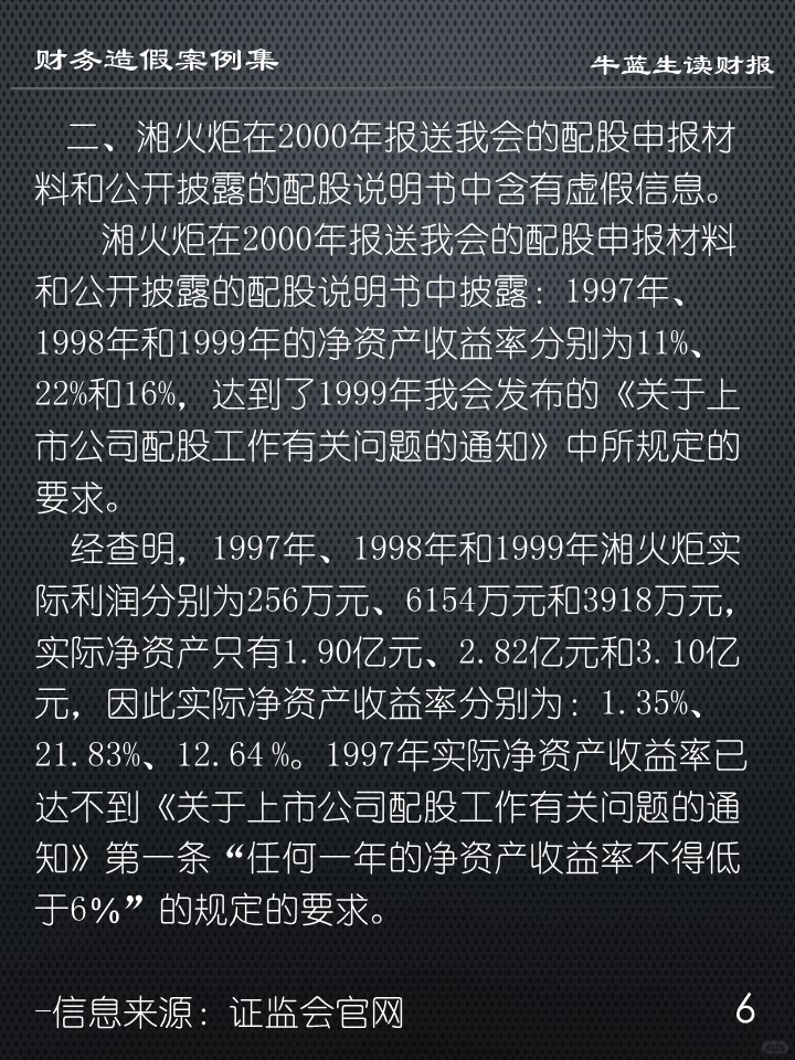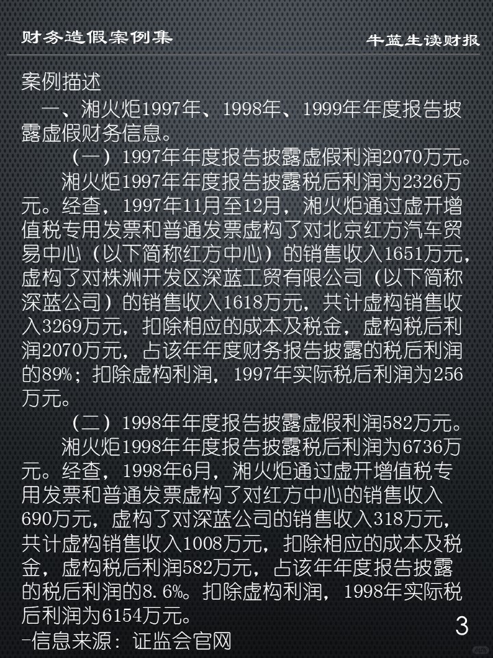 ✈公司:湘火炬 造假金额:1997-1999年合计虚增利润4400万余元 主要手段:虚开增值税专用发票和普通发票虚构销售,少计主营业务成本,等 证监会处罚文号:[2006]32号 后果:公司及相关人员被处罚。后公司退市。
