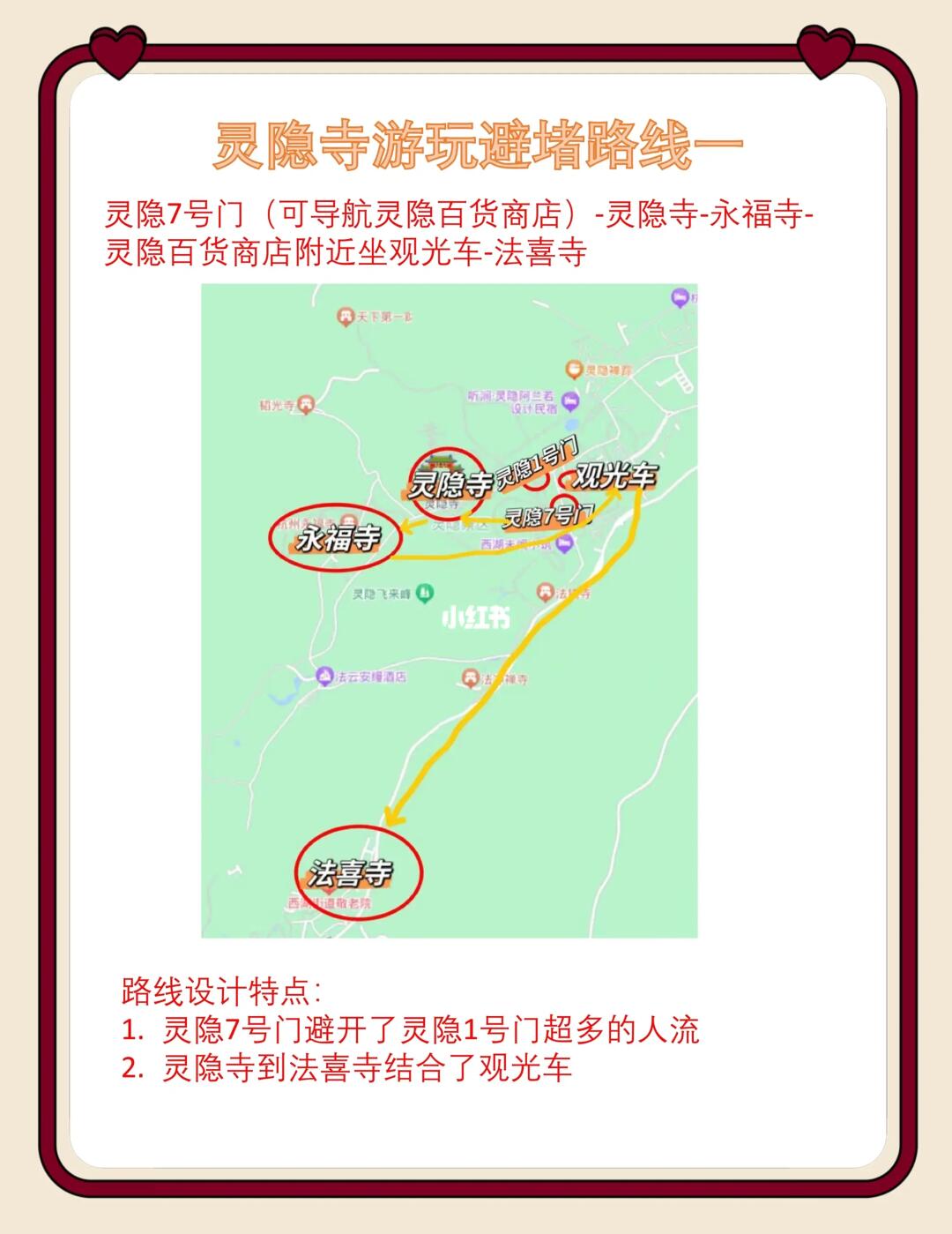 ⚠️这时候,你可以从正门边上100m左右的灵隐7号门进去,基本不用排队,路线可以按照图6、7游玩。
