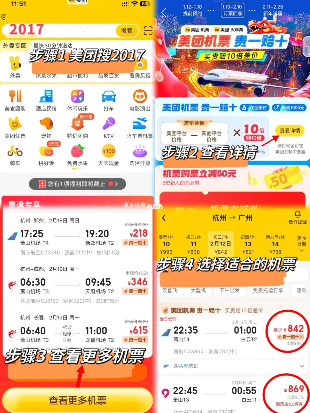 ⚠️韬爸了解到美团在春节前推出机票“贵 1 赔 10”的活动 (见图4、5)。