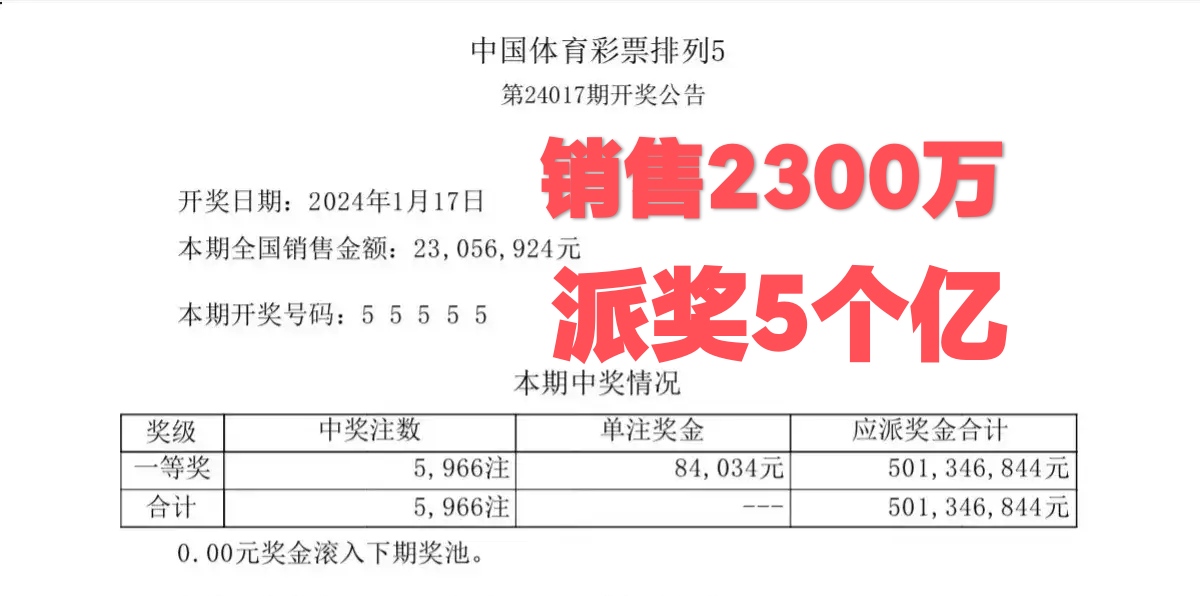 2024年1月17晚,中国体育彩票第24017期开奖,排列游戏喜迎连五豹子号,排列3当期开奖号码为“555”,全国直选号码中奖86593注,单注奖金1040元,合计派奖超9000万元。