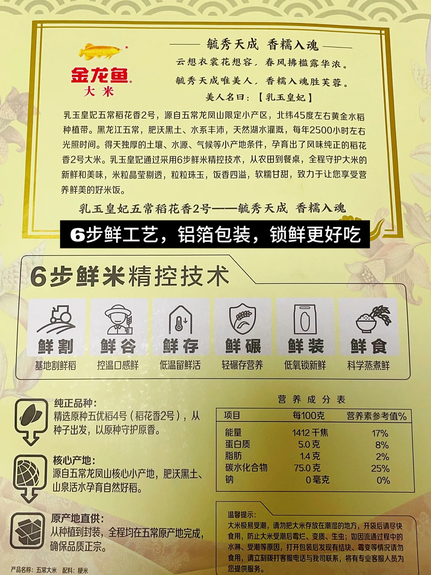 论技术,也是相当厉害了,这款大米是采用6步鲜精控技术,鲜割、鲜谷、鲜存、鲜碾、鲜装、鲜食。从田间到餐桌,全程锁鲜,直到饭桌上都能体验到大米新鲜的口感。