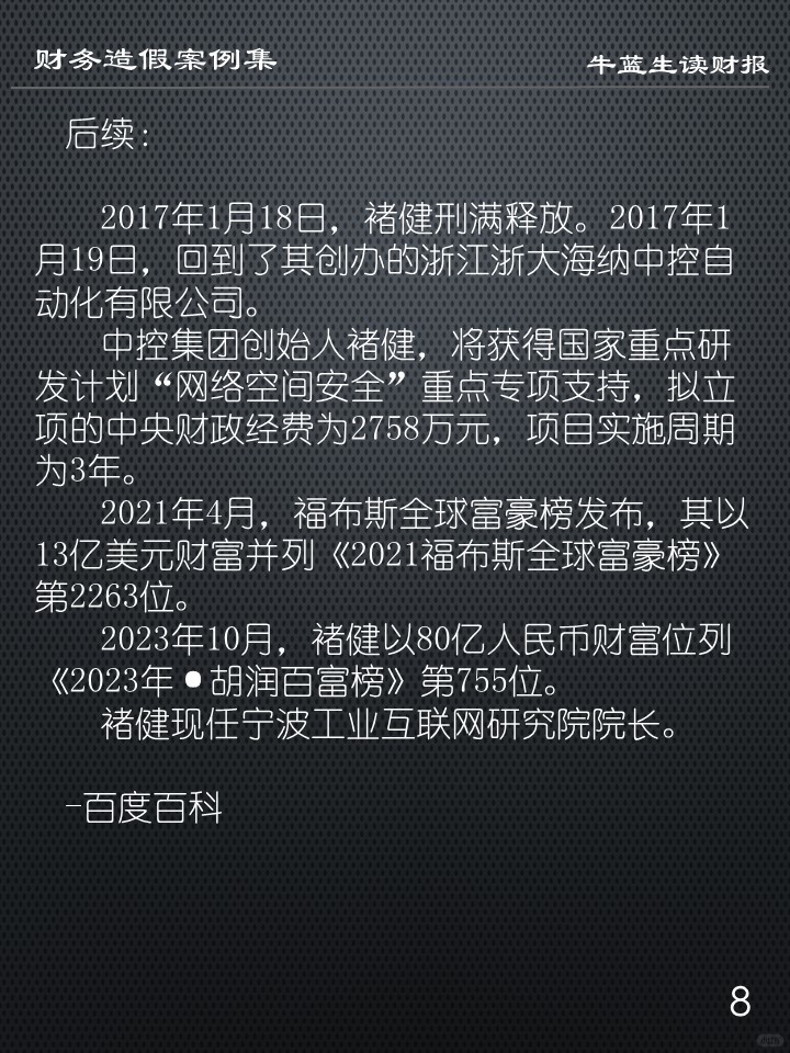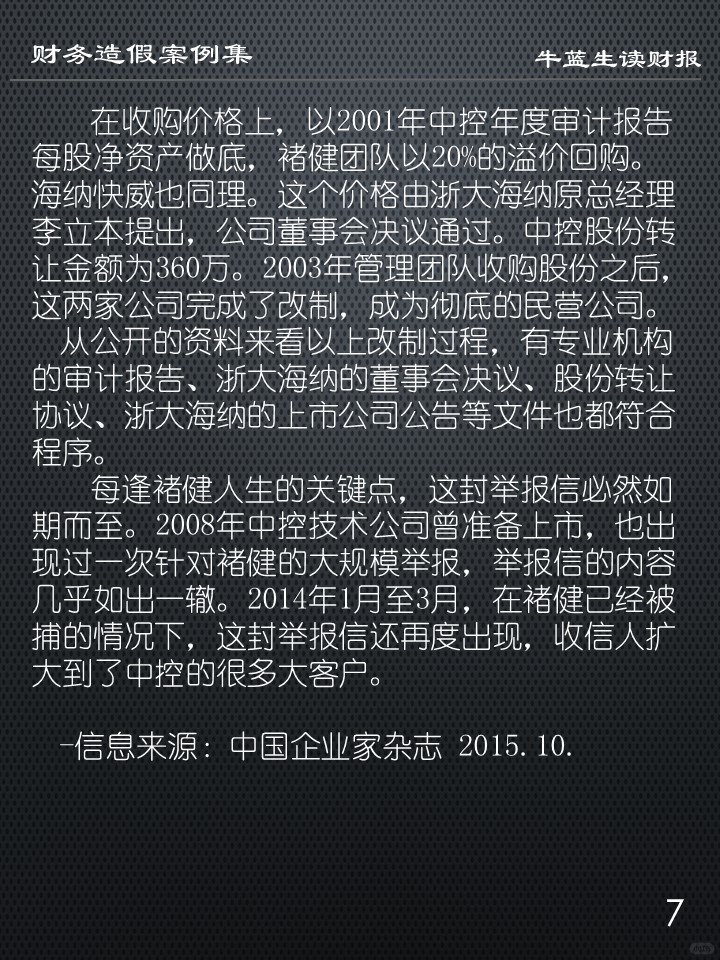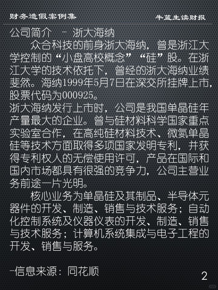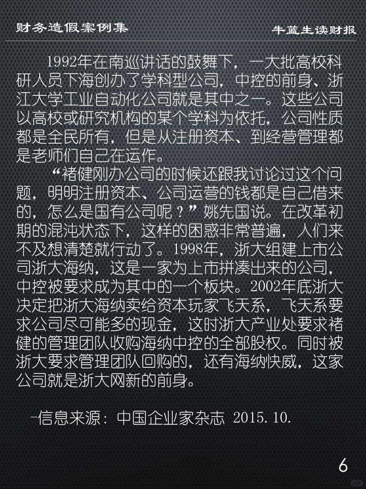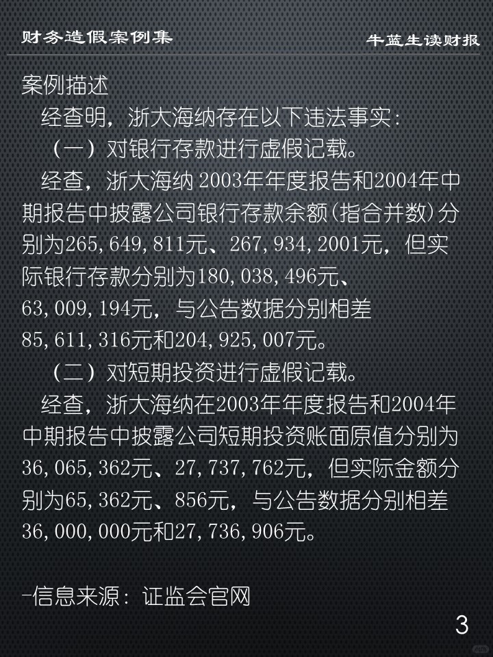 ✈公司:浙大海纳 造假金额:2003年虚增利银行存款8560万元,虚增短期投资3600万元,等 主要手段:不详 证监会处罚文号:[2007]14号 后果:公司及相关人员被处罚.后来公司被重组。