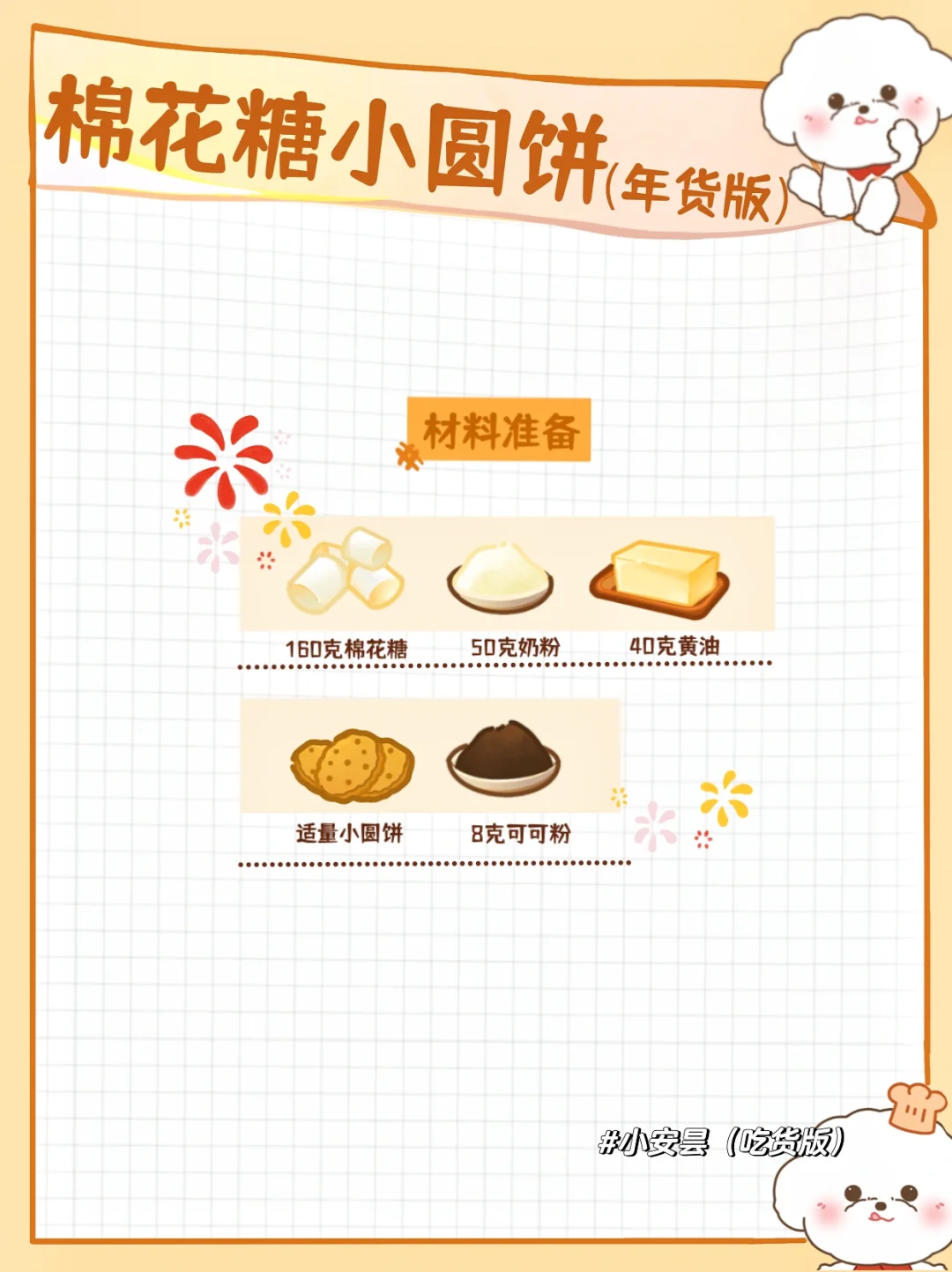 160克棉花糖➕50克奶粉➕40克黄油➕适量小圆饼➕8克可可粉