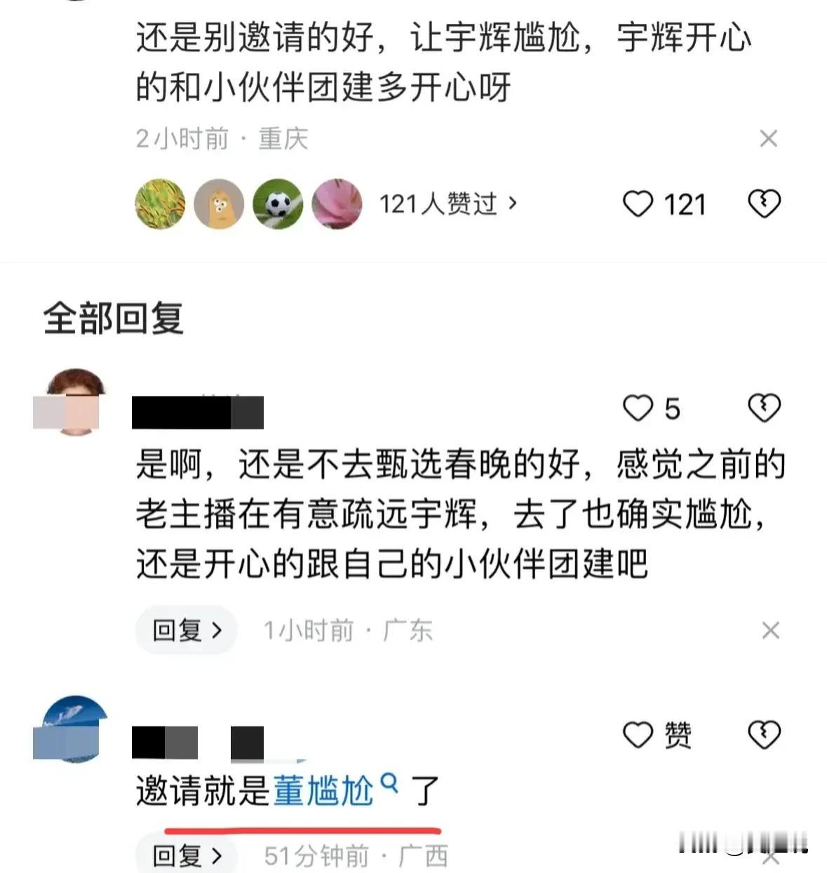 东方甄选今晚10点的“春晚”直播可真是闹得沸沸扬扬。董宇辉怕抢风头,直接选择停播去团建,这招真是高明啊,既避免了尴尬,又让自己团队玩得开心。 不过老俞可就惨了,因为没请董宇辉团队,被网友一顿狂轰滥炸。其实老俞也挺难的,两个直播间都是心头肉,哪能轻易偏心呢? 董宇辉这波操作也是挺圈粉的,不仅显示了自己的大气,还让粉丝们看到了他的团队精神。虽然没能参加直播,但相信他的粉丝们也会一直支持他的。 总之,这场“春晚”直播虽然有点小插曲,不过话说回来,大家都是图个热闹,希望东方甄选以后能多搞点这样的活动,让大家一起乐呵乐呵! #我来唠家常# #天南地北大拜年#