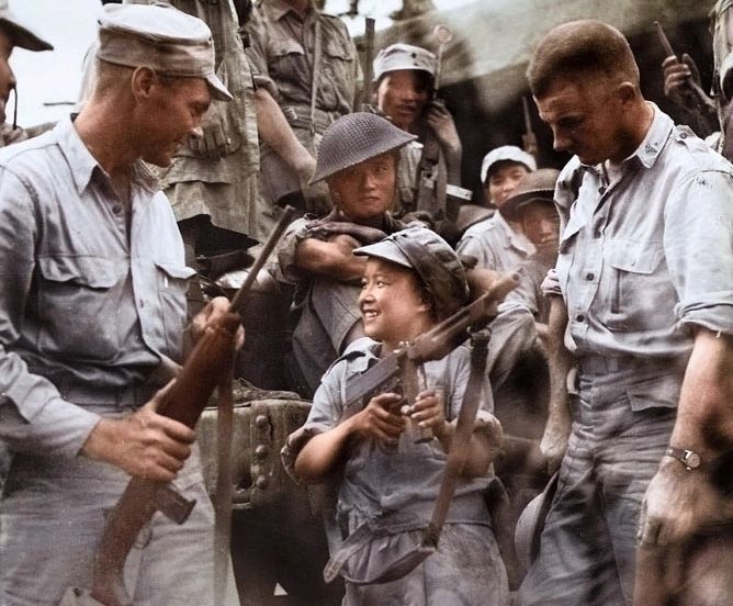 图3:1944年9月2日,中国军队第14师42团队列里最年轻的士兵。他就是云南人李乐贝(音)上等兵,年仅12岁,但是已经入伍一年。美军联络官声称李曾经连续向日军投掷了两整箱手榴弹,创造了毙伤日军的纪录。此刻,他正向两名美军联络官夸奖他的汤姆逊冲锋枪