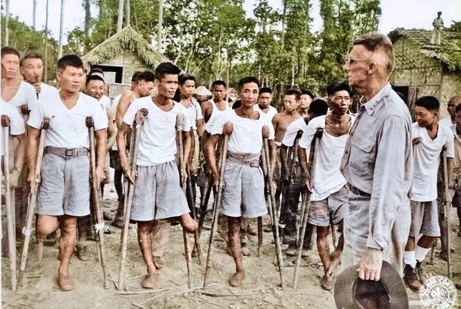 图4:1944年7月15日,在沿列多公路某处的康复营地里,史迪威将军脱帽对着一群中国退伍军人讲话。战争遗留下的伤残军人先在此学习新的生存技能——铁匠、编织、木工等,然后离开军旅回到平民生活。这个营地当时由中美共同管理经营,大约有两百名退伍士兵(全都有不同程度的伤残)