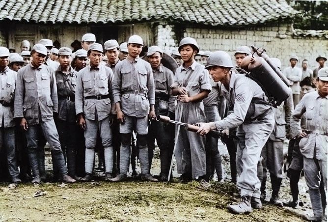 图5:1944年7月23日,密歇根州的乔治·奥利弗上尉向中国军队工兵示范火焰喷射器操作的重要步骤