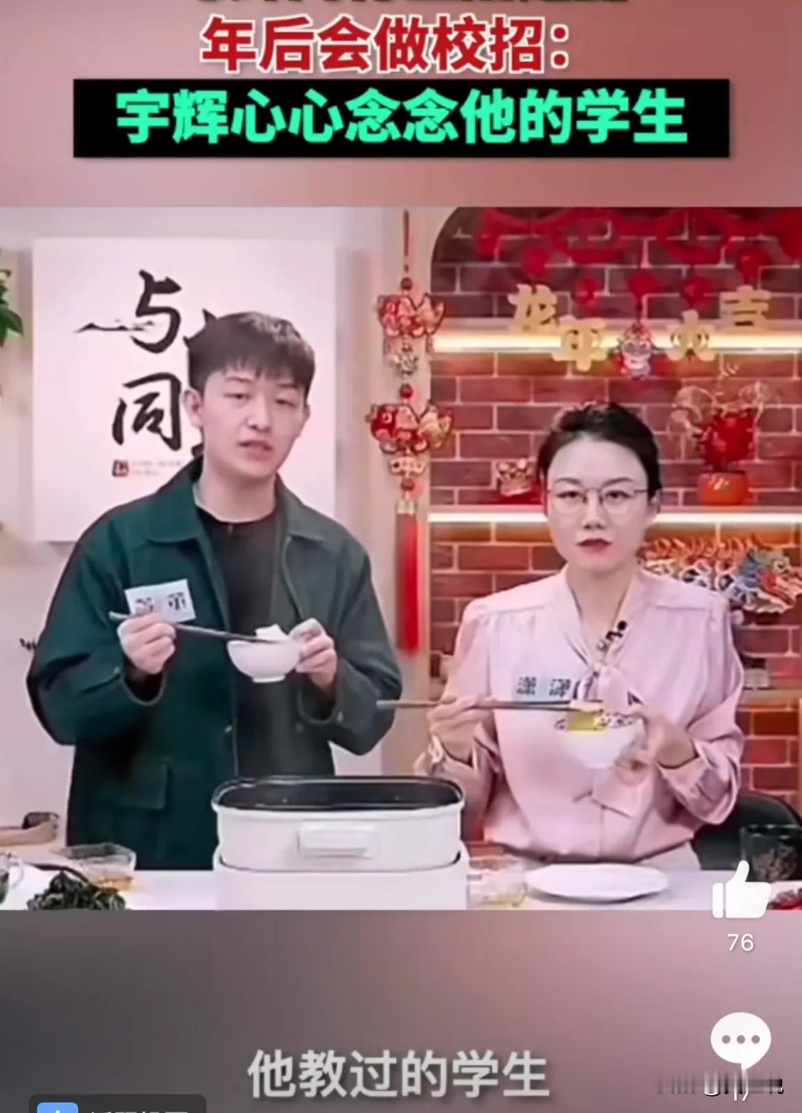 董宇辉这老师啊,心里真是只有他的学生。 在1月29日的误会通行直播间里,董董和潇潇说漏嘴了,原来董老师年后想搞校招啊! 他一提这事儿就兴奋,说:“那些学生要毕业了,但如果有一天他们能再回来,跟我一起工作,那感觉多好啊!” 哈哈,董老师真是太重感情了,就想着和他的学生们再续前缘。 期待年后的校招,看看他们能不能真的重逢! #我来唠家常# #天南地北大拜年#