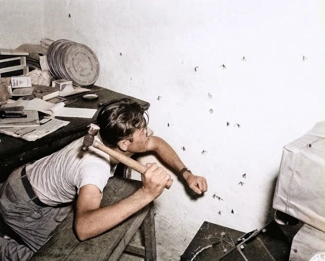 图4:“哗!”还有另一个目标在墙上。来自加州的詹姆士·罗布农技术军士手执钉锤,对着一群侵入印度蓝姆枷的“B-29”狠狠打击,当“烟消云散”的战斗结束后,发现墙上停歇着众多“飞机残骸”。“哦!真不少!这就是残酷的战争!”恐怕只能这样感叹如此奇观了