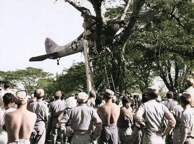 图3:1944年1月30日,中美士兵在缅甸中部的一个机场围观救援队从飞机残骸里拯救飞行员和其他三名步兵,这架美国联络飞机在尝试隆落时撞到树尖上。三名步兵乘客隶属于玛斯作战部队,这是一支经过特别训练的在缅甸中部对日作战的美军步炮联合部队