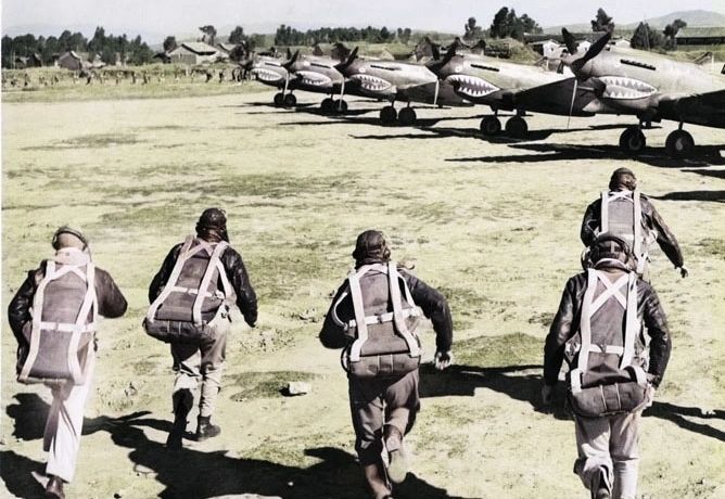 图2:美国援华飞行员对日作战。在中国某处,当空袭警报拉响时,配备隆落伞的美国飞行员飞快地跑向他们的战机,升空驱赶来犯的日军飞机。这些驾驶美国飞机的队员在飞机引擎下方画了张鲨鱼嘴。陈纳德将军的空中力量也包括轰炸机队,一直执行定期轰炸日军据点的任务