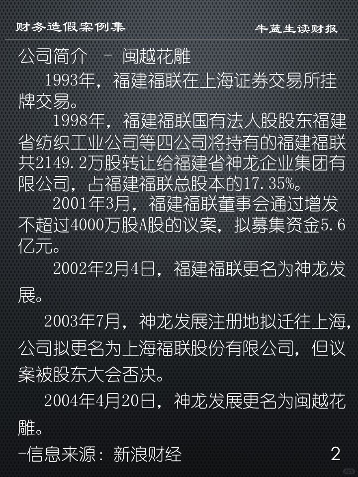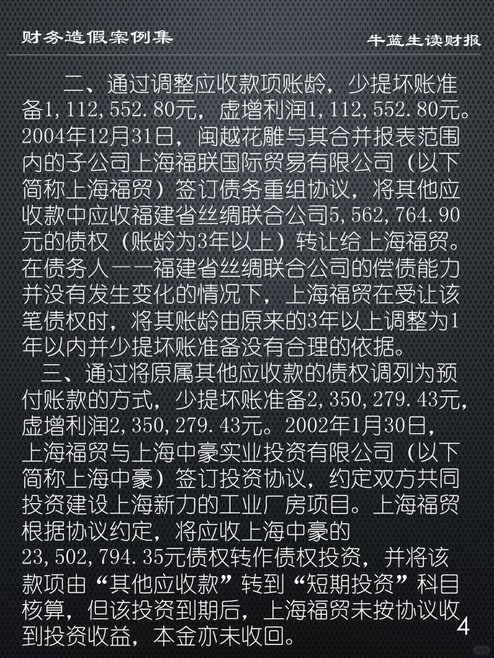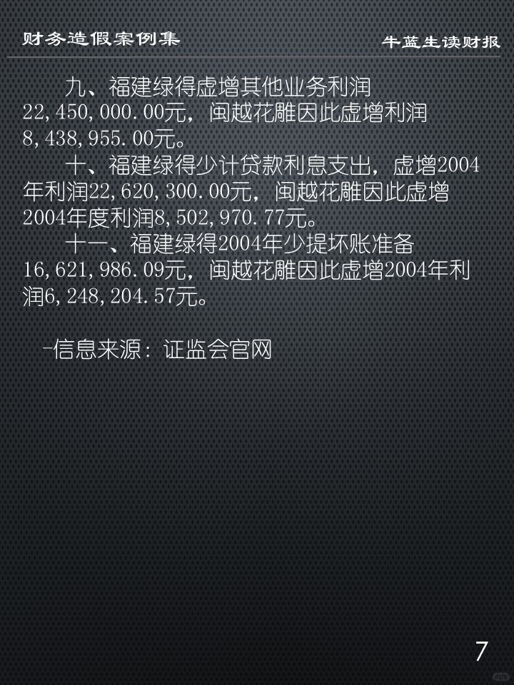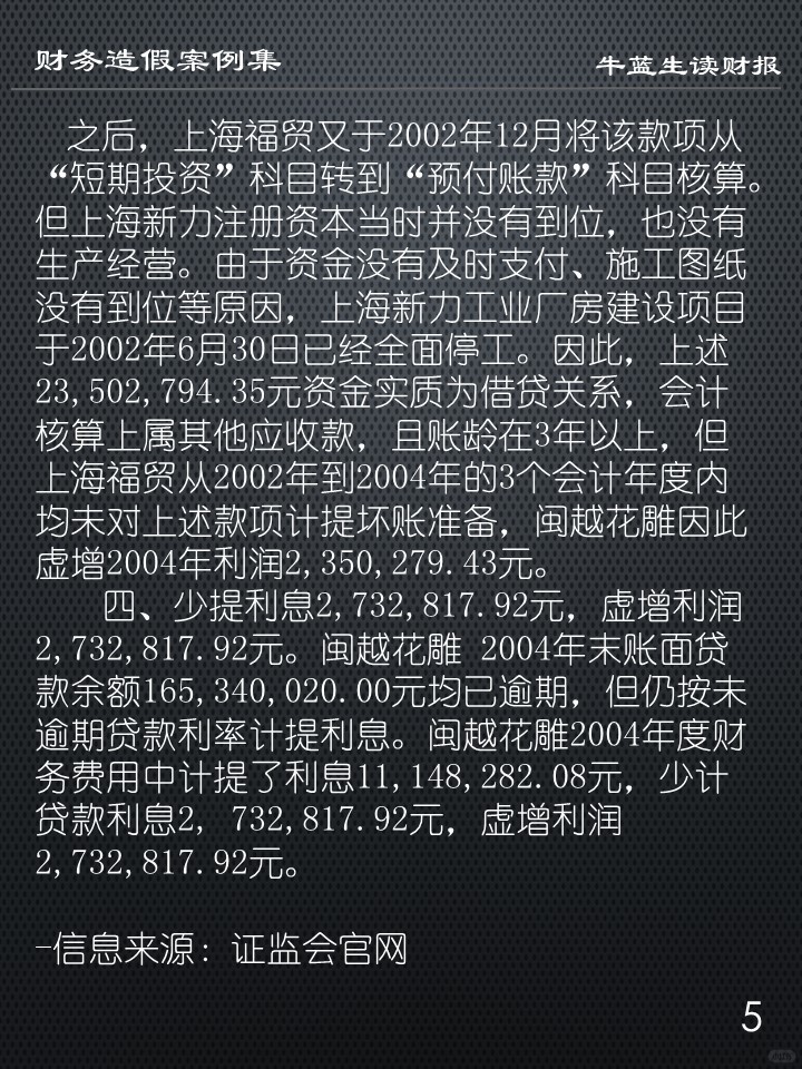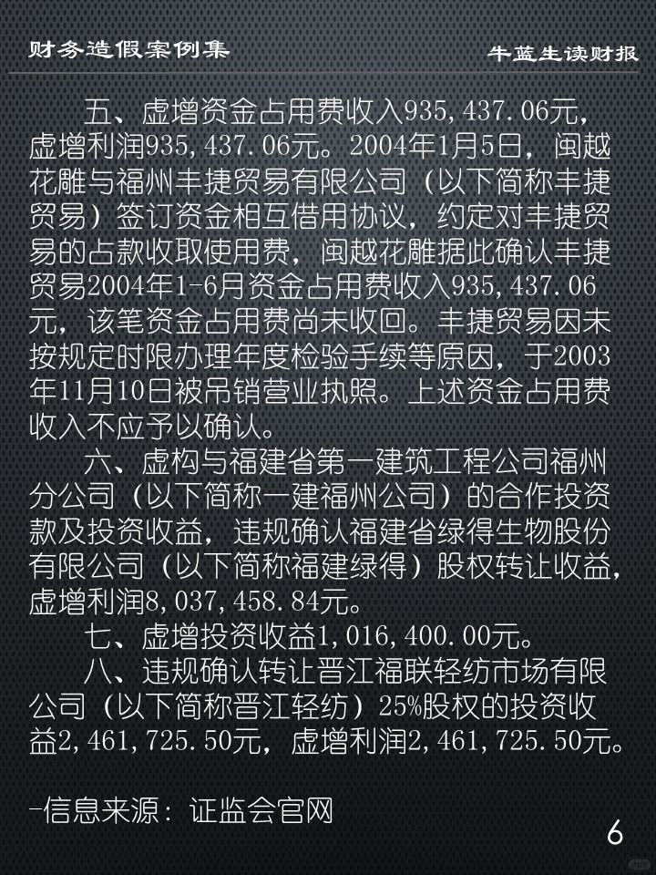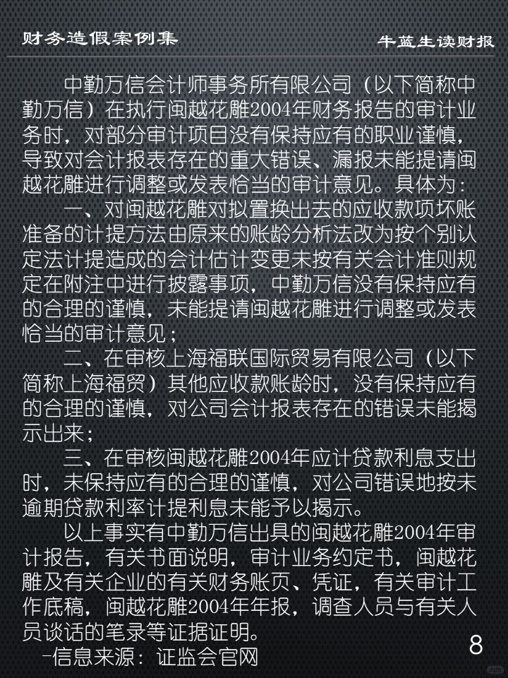 ✈公司:闽越花雕 造假金额:2004年虚增利润4828万元 主要手段:少提坏账准备、虚构交易、少计利息,等 证监会处罚文号:[2007]26号, [2007]27号 后果:公司及相关人员被处罚。公司于2006年终止上市。